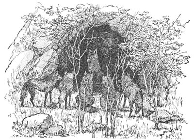Again Wongo took long sniffs of the air, and while caution told him to give old Grouch a wide berth, appetite and curiosity got the upper hand and he moved softly up the canyon toward the forbidden ground. More and more tempting grew the smell of the fresh meat, as he neared what his nose now told him must be old Grouch’s den. He stopped beside a thicket of jack-oaks and, as the smell seemed to come from just beyond it, he slowly and carefully put his head through them that he might see.