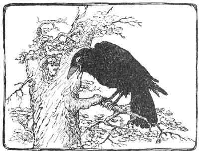 At that the crow half fell, half flopped down to the top of a near-by bush, and having straightened his face into a more serious expression said: