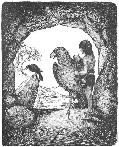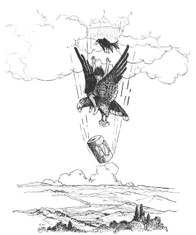 [184]Kaw was at the hole instantly. “Quick! Chu-ta-win! Quick! Cho-gay!” he called, and almost before the words were out of his mouth all three dropped down through the hole—first the eagle, who spread his wings instantly, then Cho-gay, who[185] fell on the broad back and held on tight, and then Kaw, flying easily down after them with a chuckle of triumph in his voice.