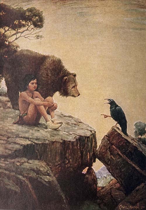 [14]While the cave-dweller was deciding between the call of his stomach and his desire to sleep, a big bluejay, with feathers rumpled by the wind, lit on a rock at the cave entrance and, after peering within, called out: