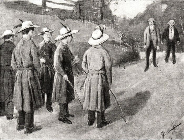 On the outskirts of our city there were open country, woods, and streams, and it was here that we were to begin our life of "Merrie men under the green-wood tree," and our first expedition was made without delay. Early one afternoon we marched forth into the streets—seven of us—each wearing his blue blouse, his arrows stuck in his belt, and his unstrung bow in his hand. We attracted a good deal of attention. There were people who looked at us and laughed, there were others who wondered, and during our march through town we frequently met with youngsters who cried "Charcoal!" and then ran away. Seven boys—no matter how they might be dressed—were not to be trifled with.