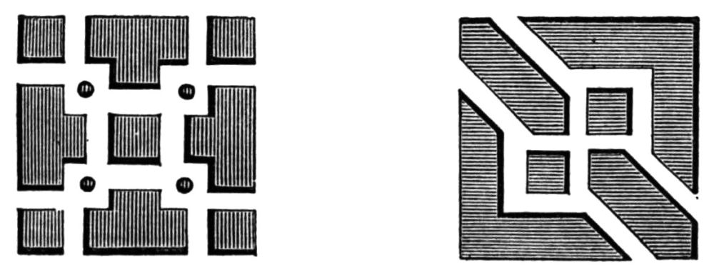 In respect to these “natural” and consequently primitive “systems” of architecture, Billington has made the following judicious remarks:—“Those people or nations who lived by the chase (and in the same class the Ichthyophagi, or fish-eaters, are included) could not for a great length of time have built themselves shelters. The long courses the hunters made prevented them from watching their property, which must have comprised [but] few articles; and they found it more convenient to make hollows in the rocks for their dwellings, or to profit by those which nature offered them in its caverns. It was the same with those who lived by fishing; passing a sedentary life on the sea shores, the sides of rivers, or the borders of the lakes, they always made themselves such abodes, or took advantage of those already formed by nature. The little industry which this{19} mode of life required, and the natural idleness which followed it, was sufficient to induce them to prefer the dwellings presented by nature, to those of art. This fact is proved by experience at the present day, as these descriptions of persons continue to adopt the same plan of life in countries where the arts of civilization have not extended their beneficial influence. The pastors or shepherds, as they were inhabitants of plains during a great portion of the year, could not make use of the retreats hollowed and prepared in the mountains and rocks by the hand of nature; being obliged to seek change of pasture, and thus lead an ambulatory life, it was requisite to have dwellings or shelters that could be carried with them wherever they went, and hence originated the use of tents. But the active operations of agriculture requiring a definite situation, necessity suggested the propriety of building solid and fixed abodes. The agriculturist then, living on his own grounds, and in the enjoyment of his property, had to store his provisions; it was therefore necessary to have a habitation at once commodious, safe, healthful, and extensive; and the wood hut with its roof was soon erected.”