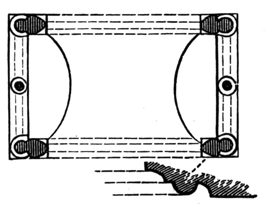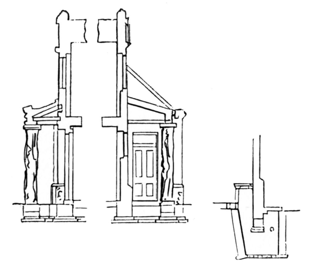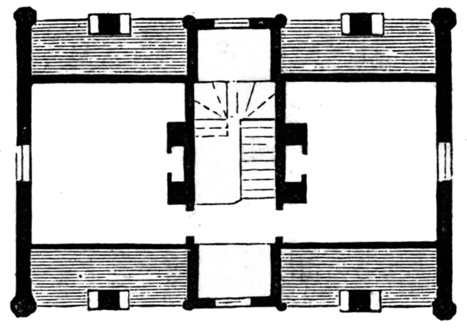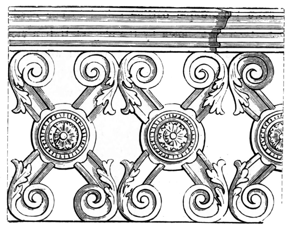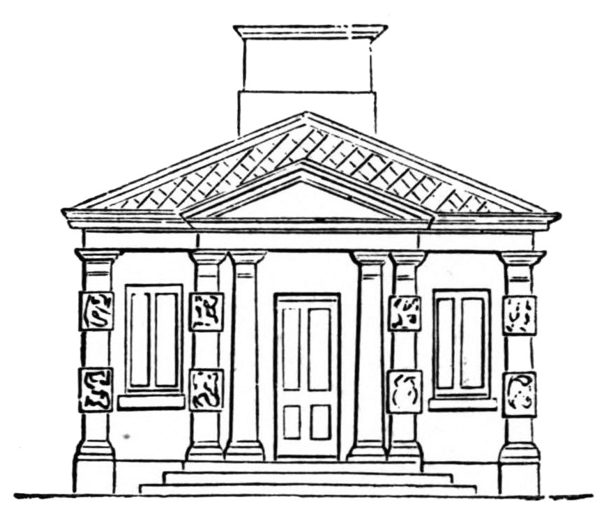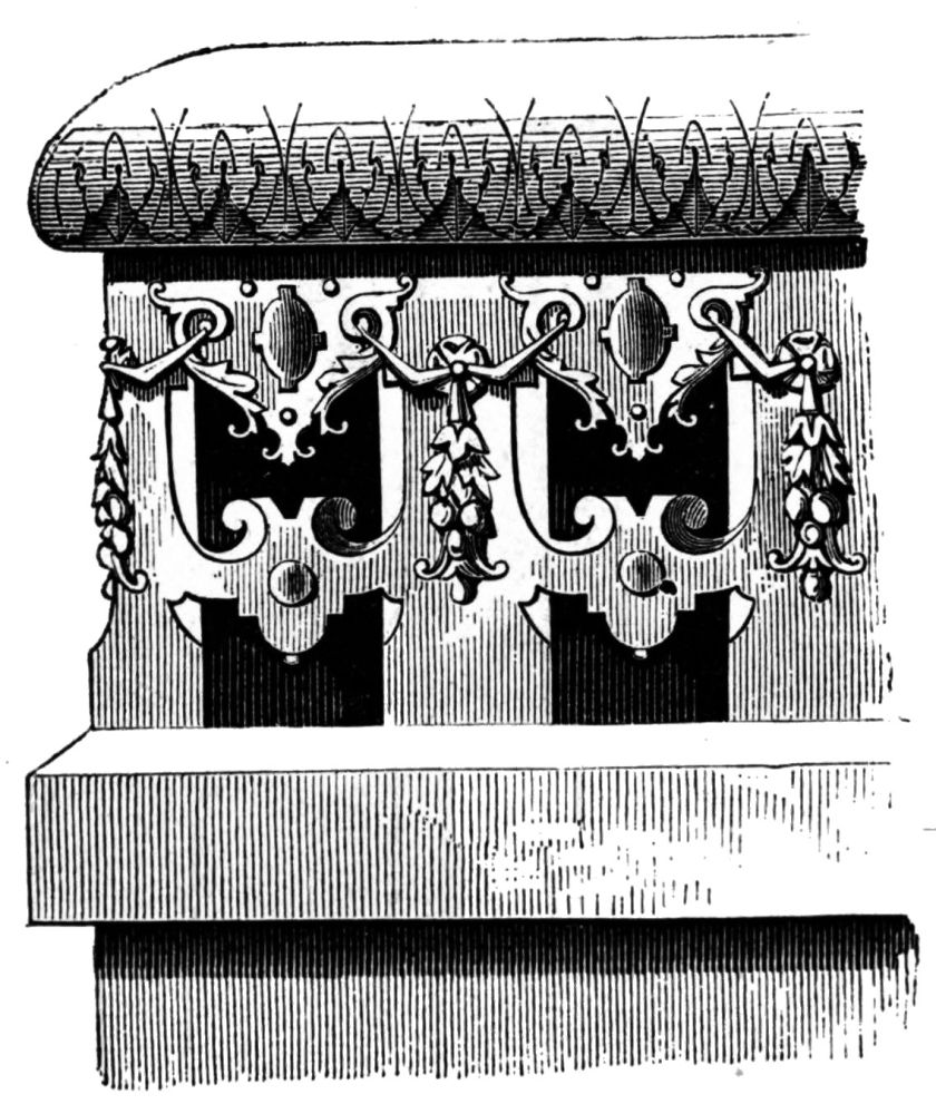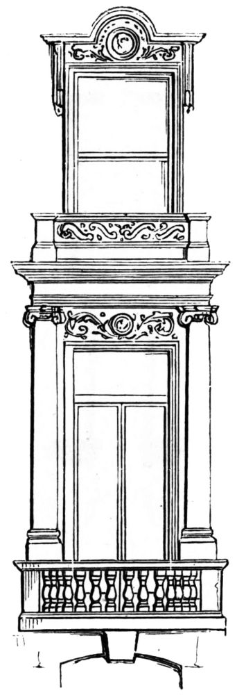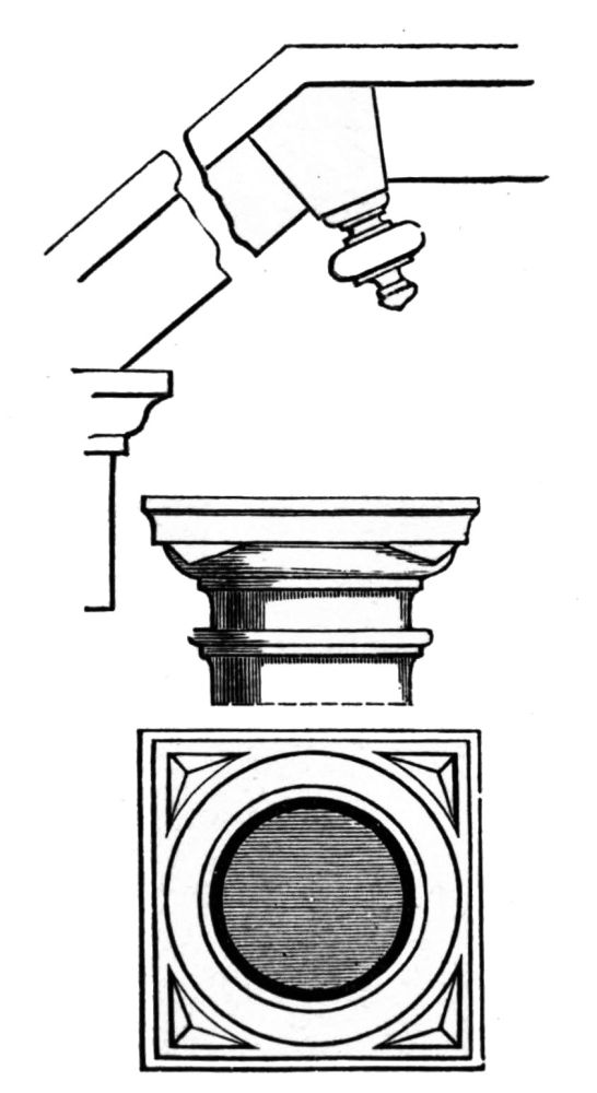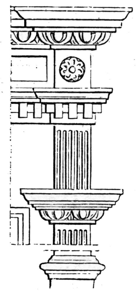 At the present day the Orders of Grecian architecture are fundamental to the principles of modern art in numerous varieties of detail; they have survived the prejudices, fancies, and dicta of various schools of art, although, as already shown, the Gothic and other systems have become formidable competitors, and in many cases, especially in regard to the picturesque, efficient, elegant, and ornamental substitutes. The taste for the latter characteristic has led to an increased adoption, for example, of the Italian style, which in many respects resembles the Grecian, but differs from it especially in lightness of detail, with greater variety. The author just quoted traces the origin of the Doric Order of the Greeks to a primary adaptation of the trunks of trees as external supports of the wooden dwelling, seeing in them the foreshadowing of the column designative of that order. “As trees are of greater circumference at their lower extremities, and diminish in rising, the diminution of the column was suggested by them.... These timbers{21} (as supports) consisting of trunks of trees planted in the ground, offered not as yet the idea of bases and pedestals, as is seen in the Doric Order, which is without base. But in the course of time the inconvenience of this method was perceived, as it exposed the wood to rot, and to remedy this inconvenience pieces of wood were placed under each support to give it a better foundation, and to protect it from humidity. This practice may be traced in some of the ancient edifices in which the columns have no other base than a block of stone. But afterwards, the number of pieces of wood employed for the base was increased, in order to give greater elevation to the supports, or to effect better security against the effects of humidity. From this multiplication of blocks as footings, sprung the torus and other mouldings of the base, an origin far more probable than that of ligaments of iron, as imagined by Scamozzi and others. It is also more conformable to the nature of capitals, in which it is known that the same proceeding was employed. After beginning with a simple abacus, several others were afterwards added, which were enlarged, as they rose, one above another, in such a manner that as the base was to the column a kind of footing on which it rested more solidly, so the capital made a head more capable of receiving and supporting the weight and form of the architrave, a large beam placed horizon{22}tally on perpendicular supports, and destined to receive the covering of the whole edifice.”