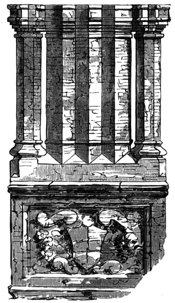 The entrance to the Acropolis of Athens, with its noble equestrian statues in the foreground, the steps between them, and the beautiful temples rising at different heights behind, giving a varied outline, the whole probably delicately coloured, must have been picturesque in the highest degree. The Temple of the Winds and the Monument of Lysicrates were equally examples of the picturesque. Yet although great efforts were made on the publication of Athenian Stuart’s volumes to introduce pure Grecian architecture here, it has obtained no hold with us. St. Pancras Church, and St. Stephen’s, Camden Town, are probably the last specimens in our metropolis. The delicate mouldings of the one are destroyed by the roughness of the climate, and the beautiful figures of the Caryatidæ in the other are covered with soot.