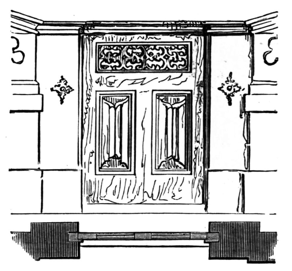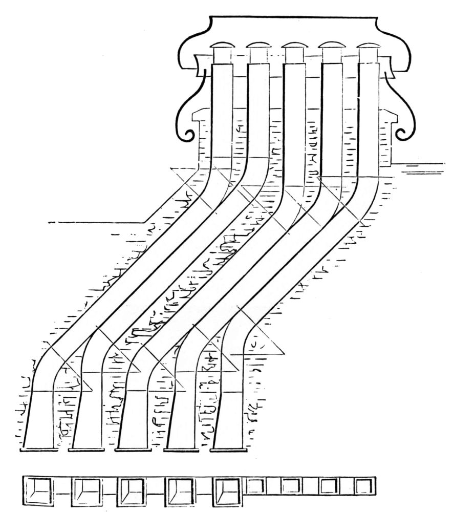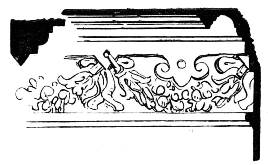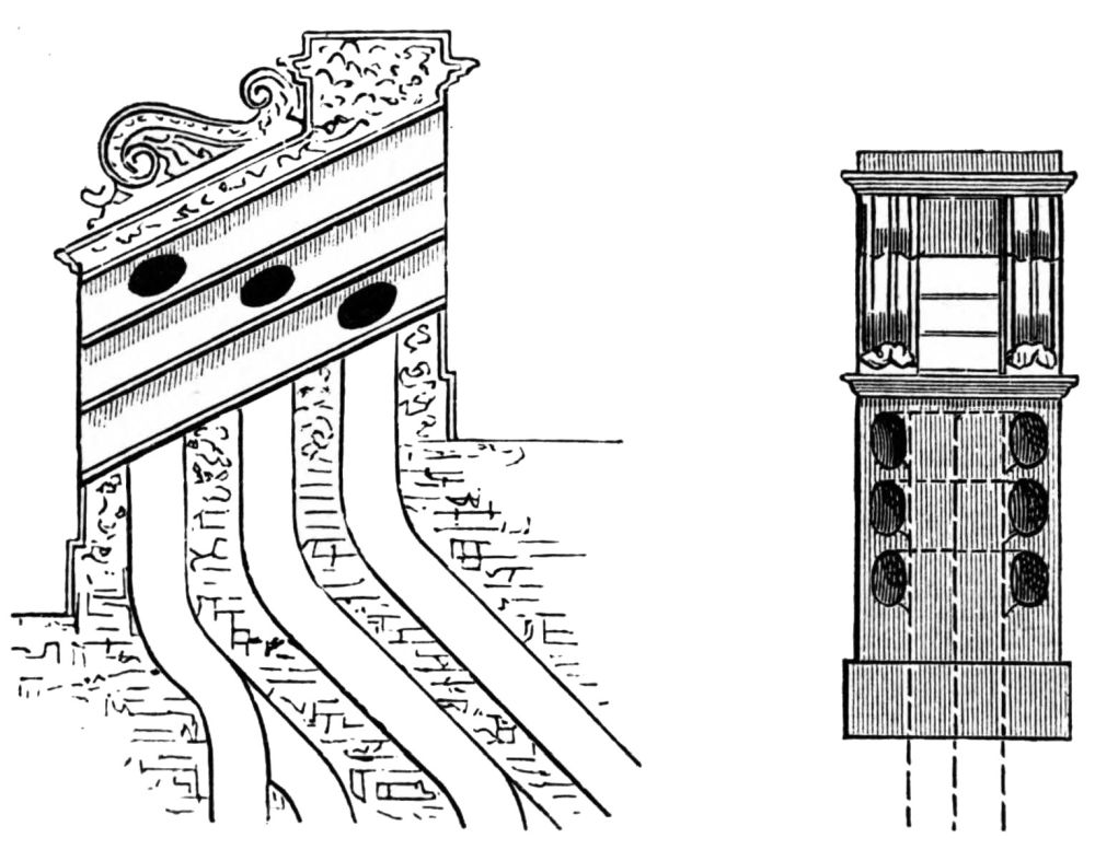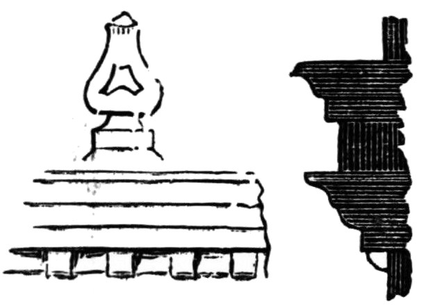 The same author considers that there is not the least certainty of this primitive wooden construction, with its inclined roof, having been the universal model of all nations, but especially in regard to Egypt and{20} China. The peculiarities of the early Chinese style of architecture have been already named, and with the persistent continuity in one course yet prevalent, that style is still preserved. But the Grecian style was evidently founded on the rude model, and the ingenuity of that nation eventually led to the transference of material from wood to stone.