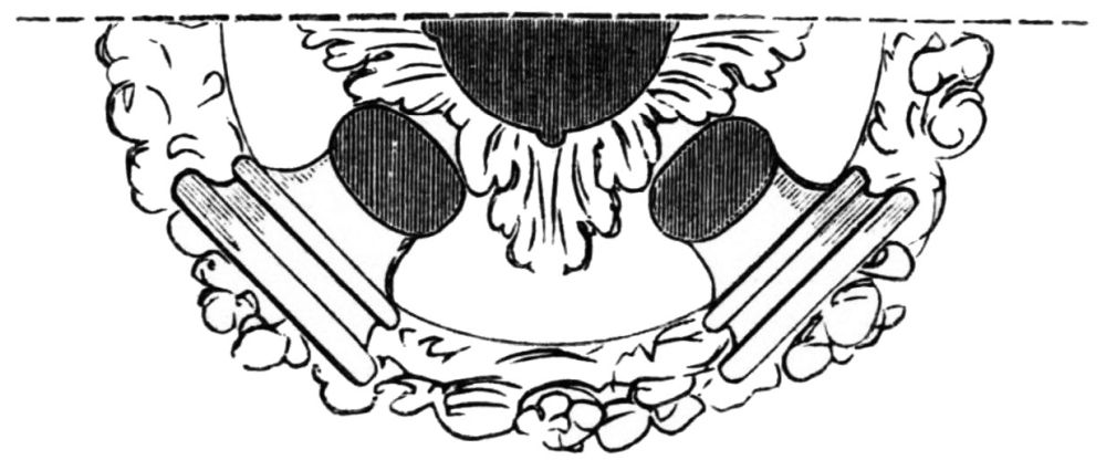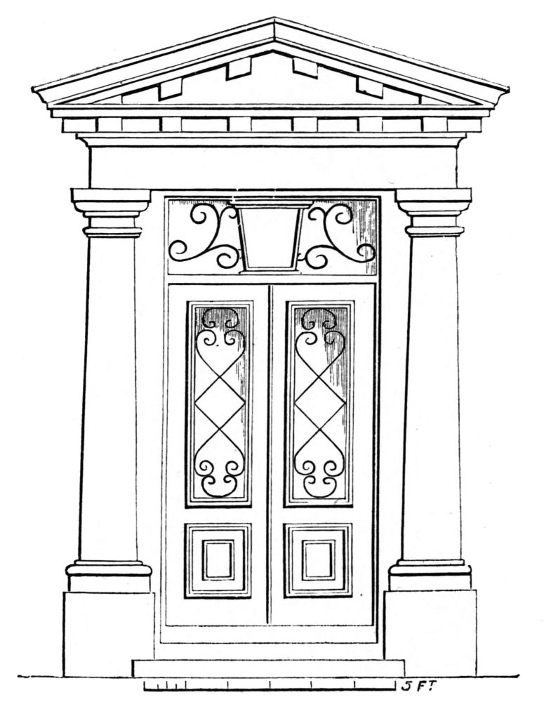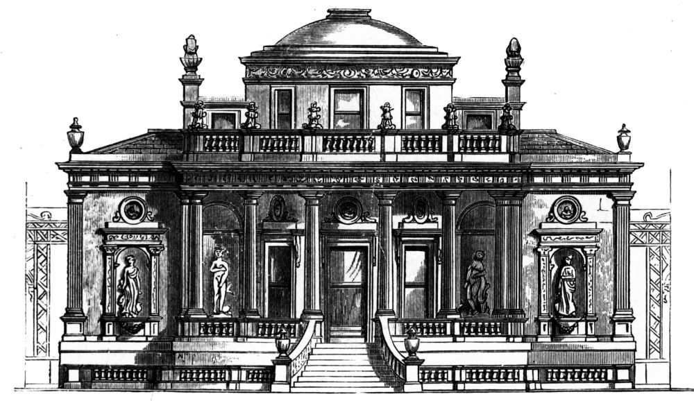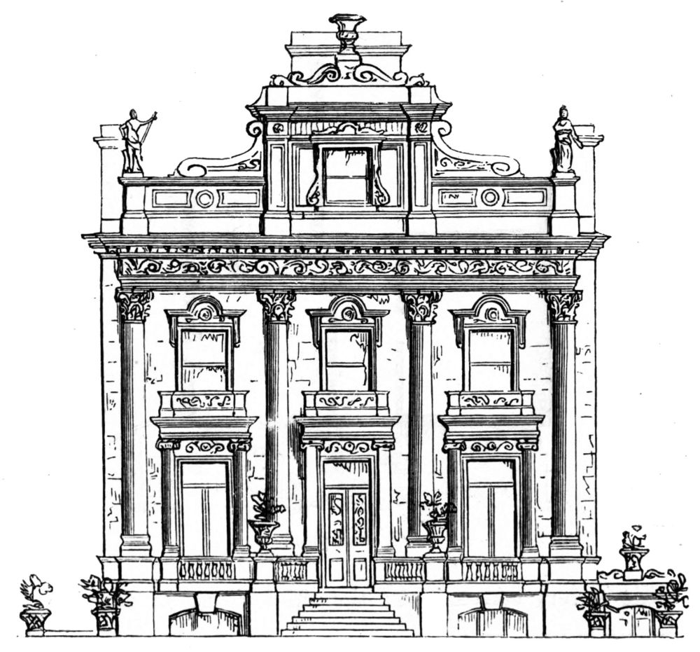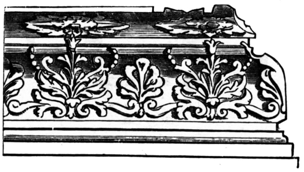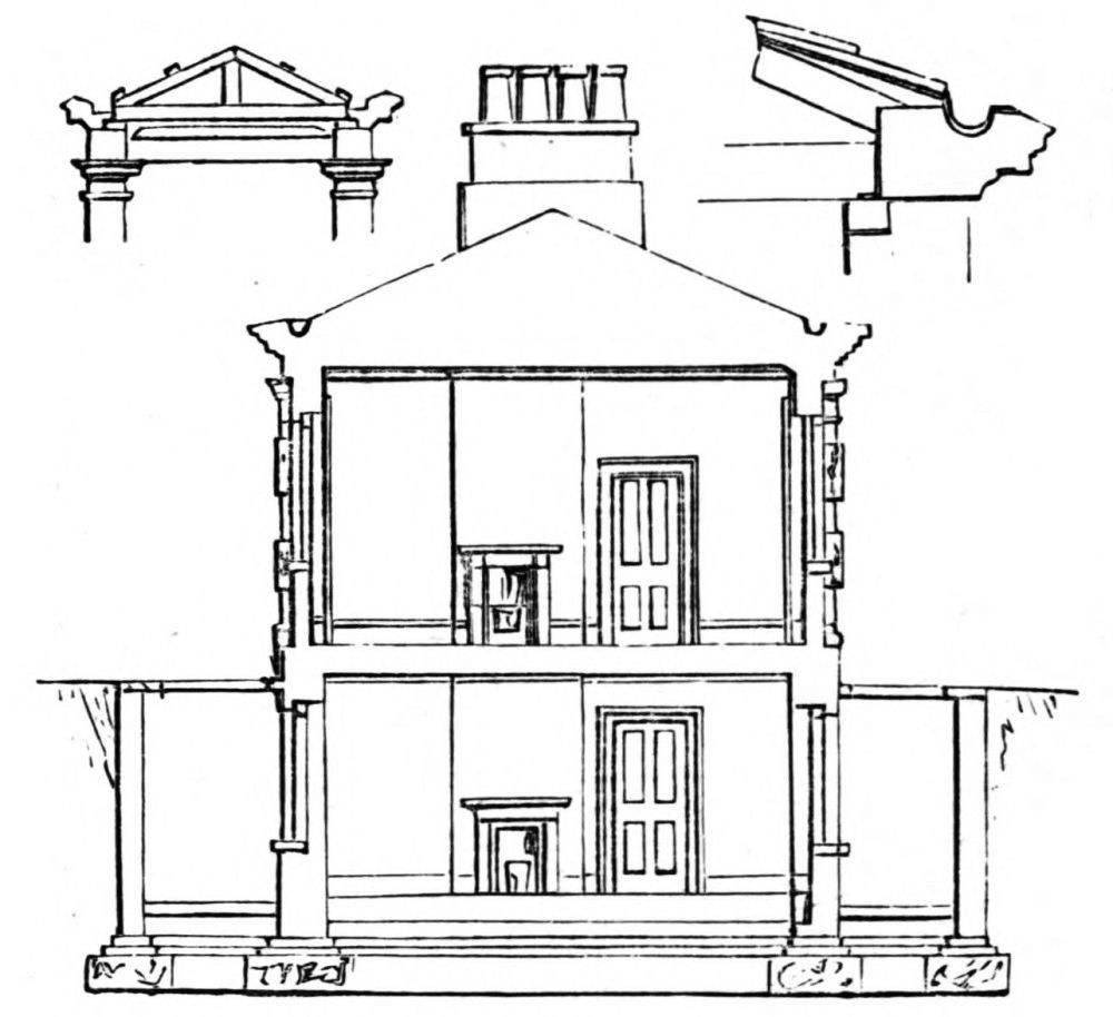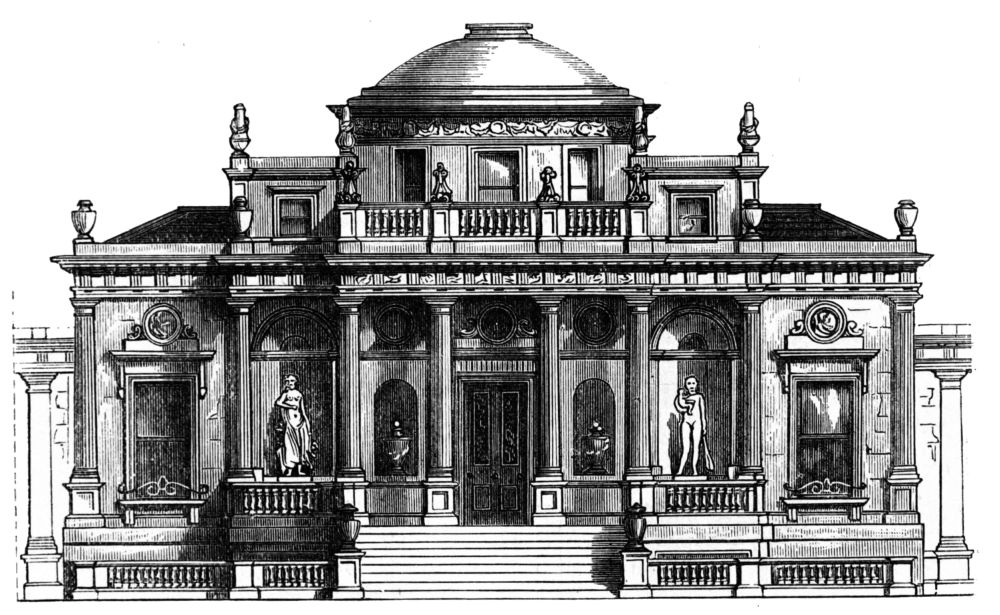 In our modern Grecian architecture large cornices are repeated, with windows ranged perfectly in the same line, and these lines often more strongly marked by a horizontal fascia. There are few breaks of any great depth; and if there be a portico, the shadow made by the columns is very trifling compared with that broad horizontal shadow proceeding from the{13} soffit (that is, the under side of the heads of apertures, architraves, and the corona of cornices). The only ornament its roof will admit, is either a flat pediment departing very little from the horizontal, or a dome still rising from a horizontal base.