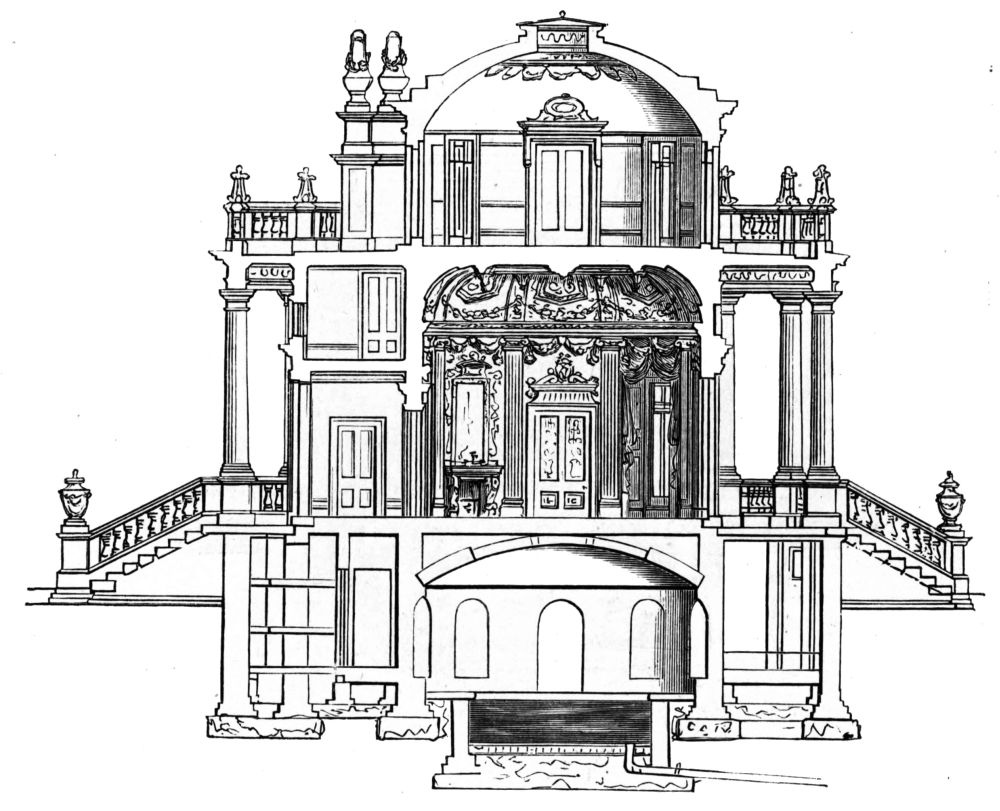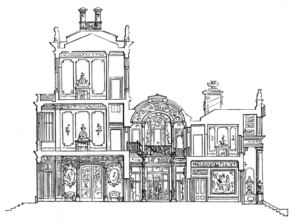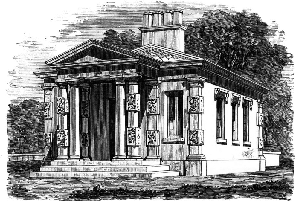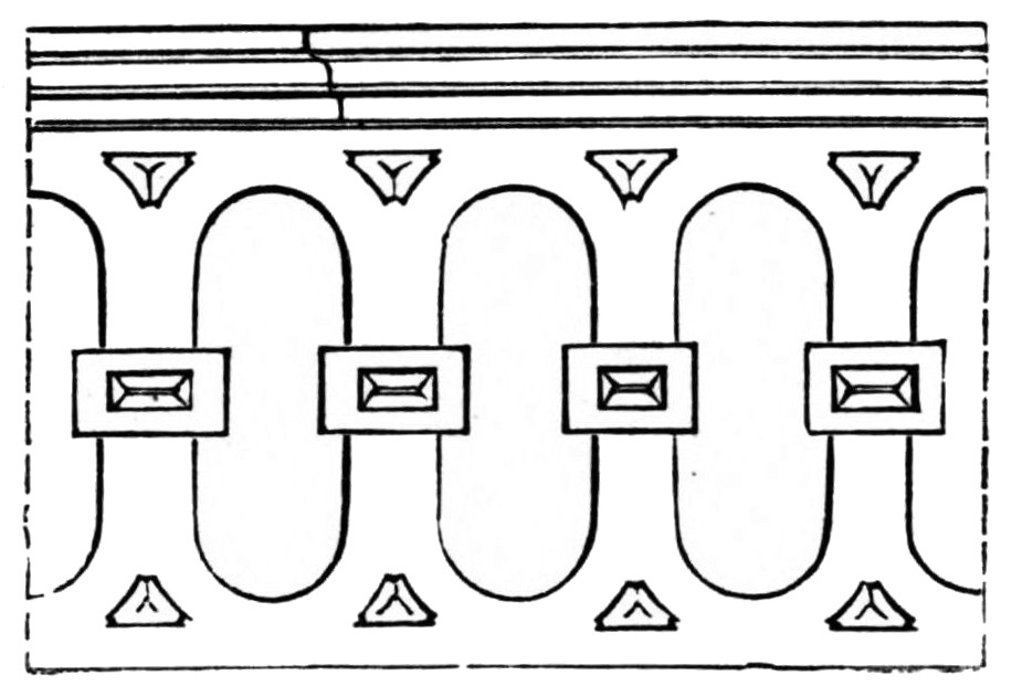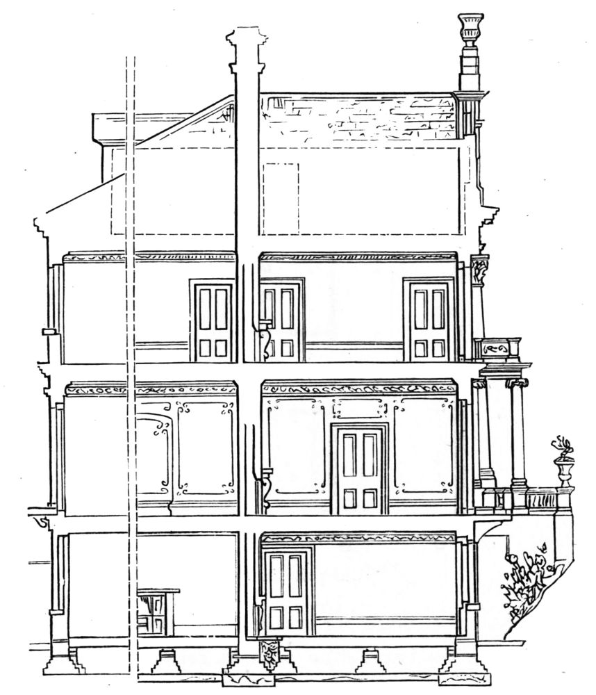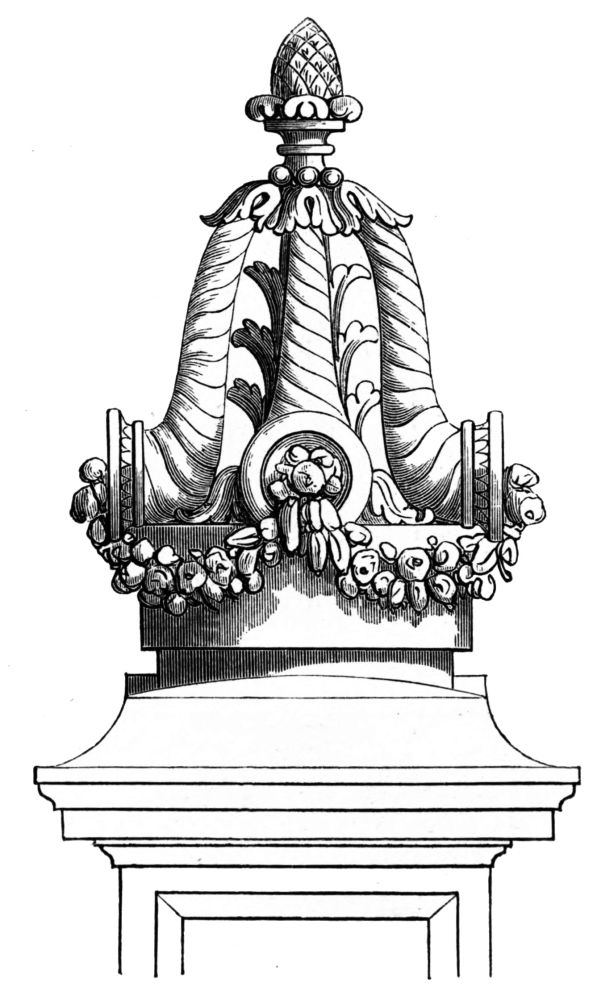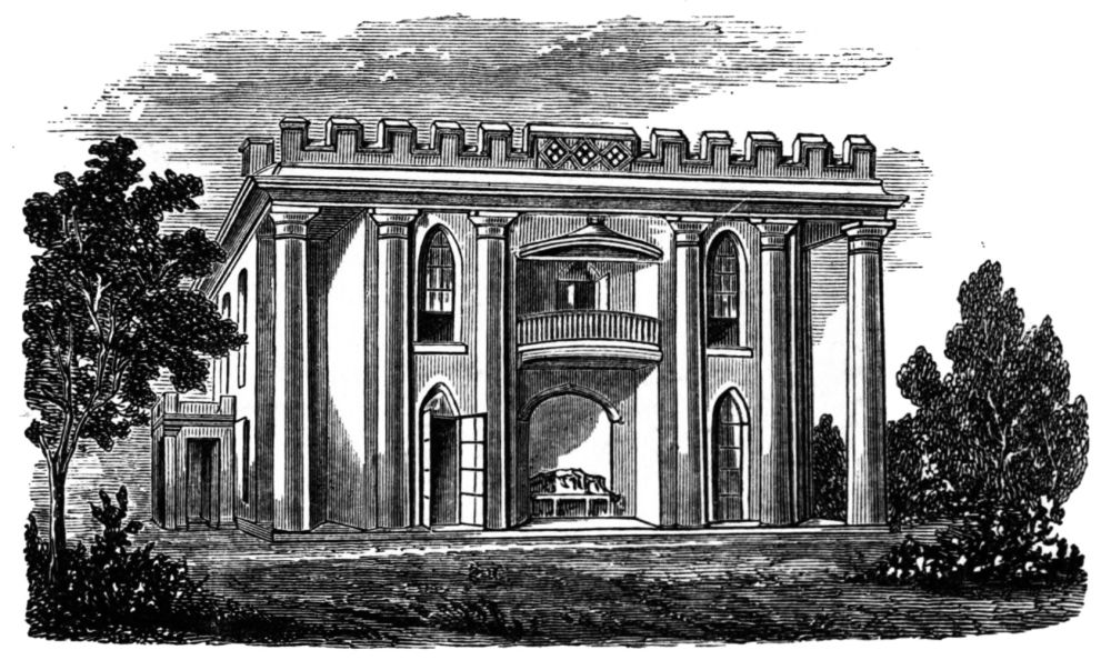 In our modern Grecian architecture large cornices are repeated, with windows ranged perfectly in the same line, and these lines often more strongly marked by a horizontal fascia. There are few breaks of any great depth; and if there be a portico, the shadow made by the columns is very trifling compared with that broad horizontal shadow proceeding from the{13} soffit (that is, the under side of the heads of apertures, architraves, and the corona of cornices). The only ornament its roof will admit, is either a flat pediment departing very little from the horizontal, or a dome still rising from a horizontal base.
