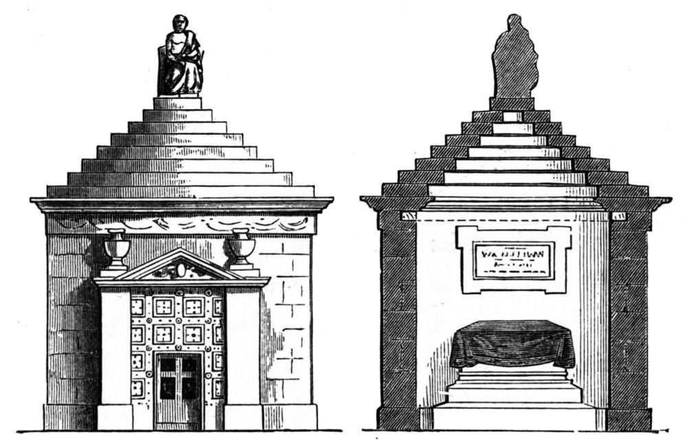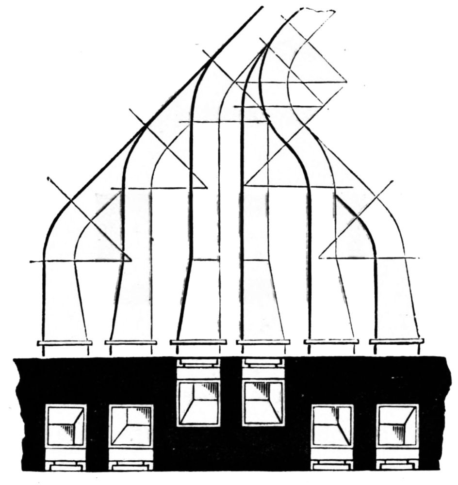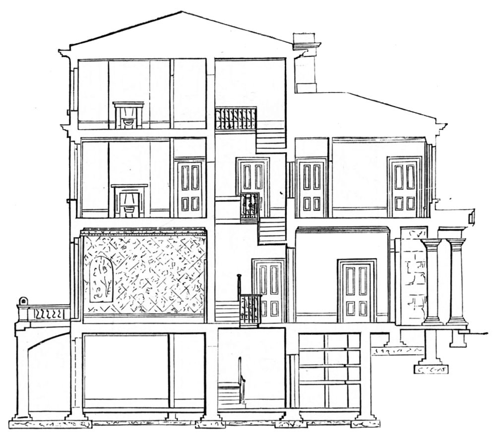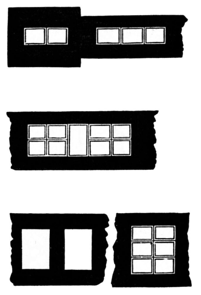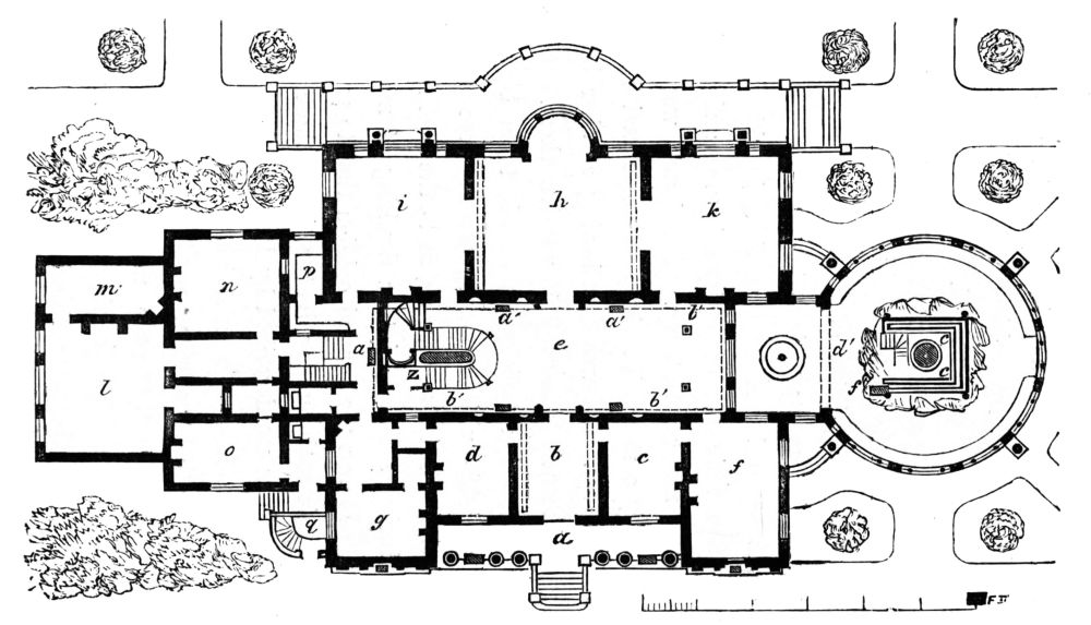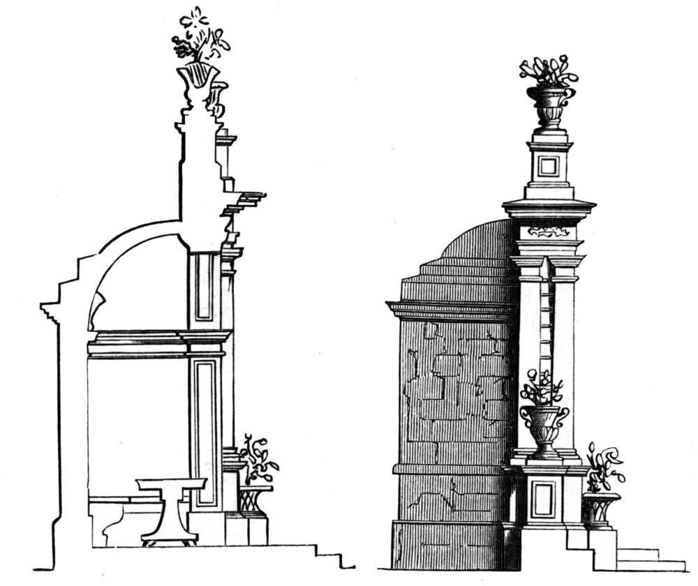 In our modern Grecian architecture large cornices are repeated, with windows ranged perfectly in the same line, and these lines often more strongly marked by a horizontal fascia. There are few breaks of any great depth; and if there be a portico, the shadow made by the columns is very trifling compared with that broad horizontal shadow proceeding from the{13} soffit (that is, the under side of the heads of apertures, architraves, and the corona of cornices). The only ornament its roof will admit, is either a flat pediment departing very little from the horizontal, or a dome still rising from a horizontal base.