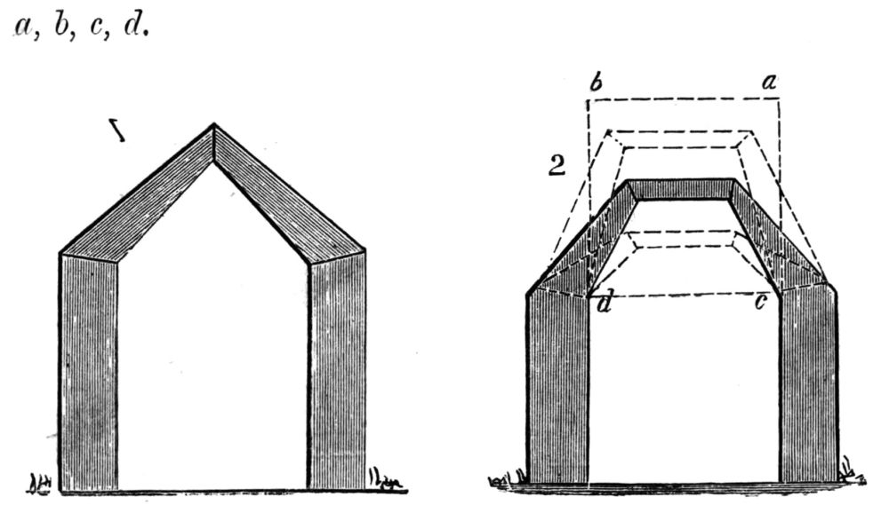 The author goes on, in a similarly ingenious manner, to prove the derivation, from nature, of the Orders of Grecian architecture. He ascribes the form of the roof as having necessarily suggested that of the pediment. On this point he quotes the remark of Cicero: “It is not to pleasure that we are indebted for the pediment of the Capitol and those of our temples: necessity suggested the form for the better draining off the water; nevertheless, its beauty is so very great, and it is become so necessary for edifices, that if a Capitol were to be built in Olympus, where it was never known to rain, it would, notwithstanding, be necessary to give it a pediment.”