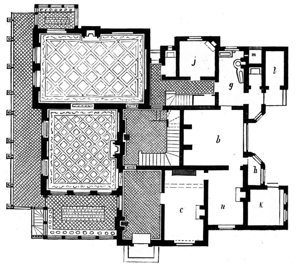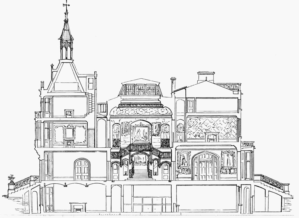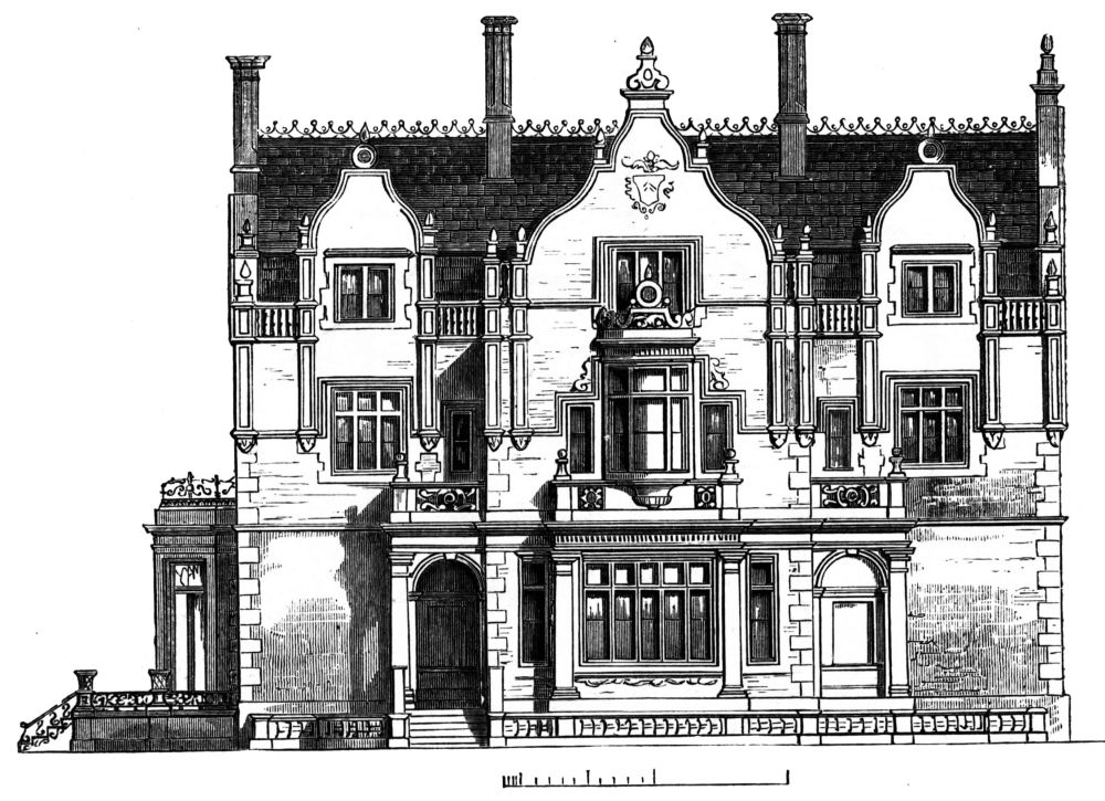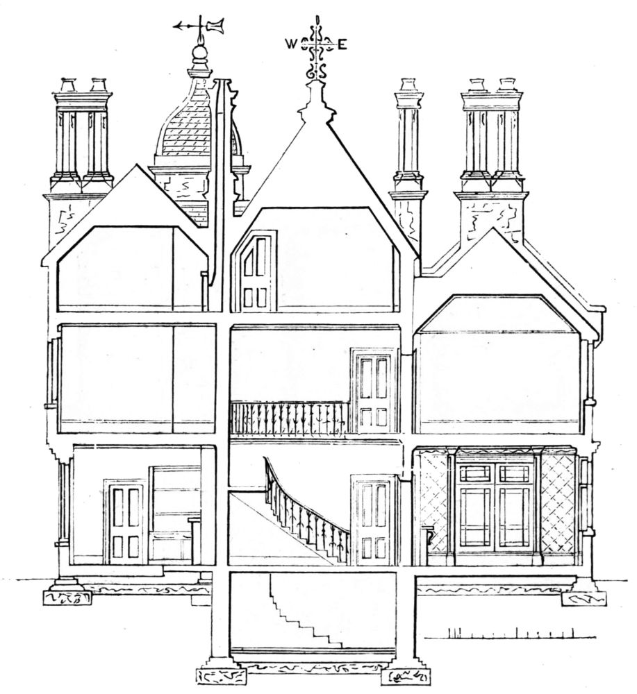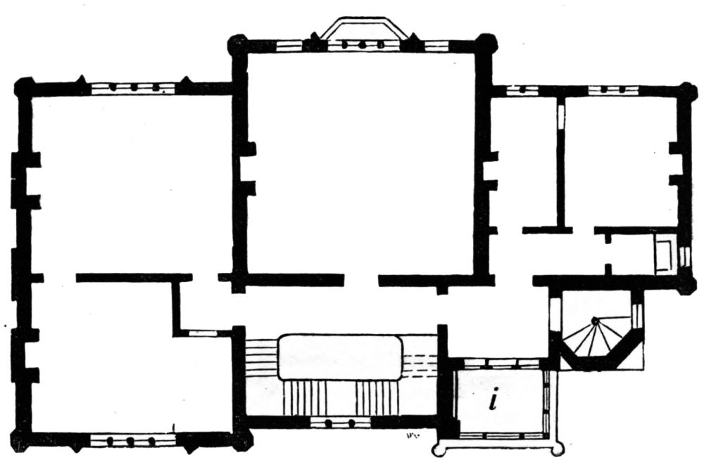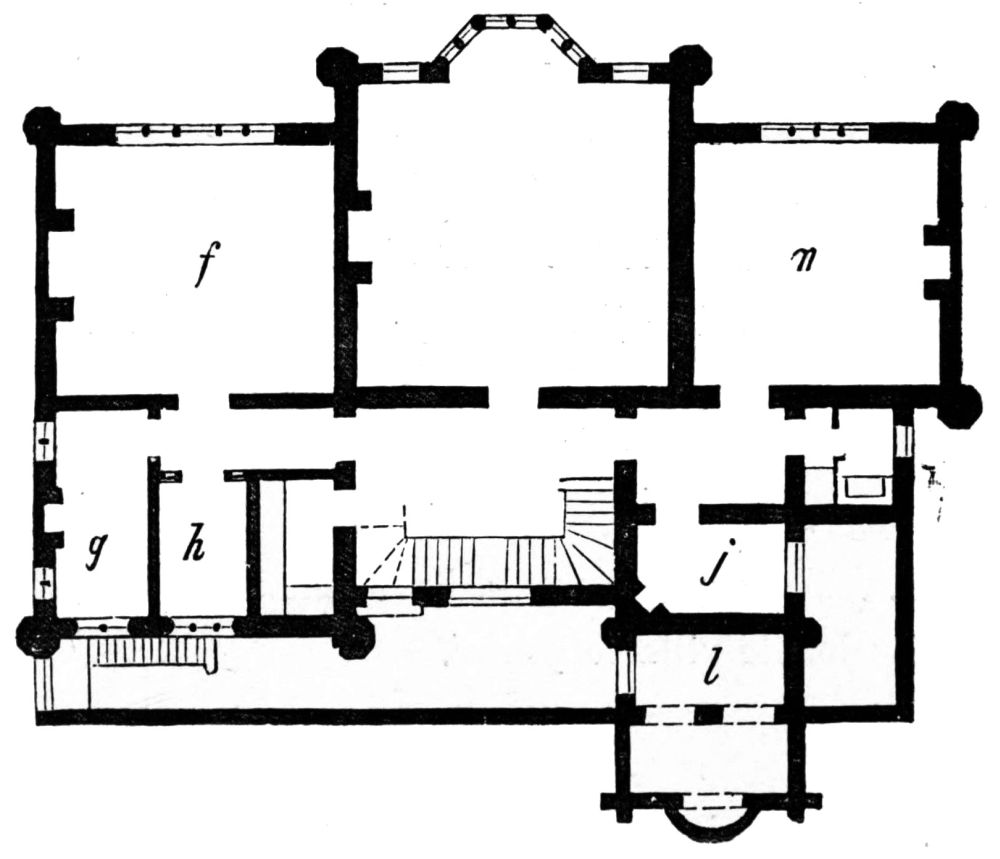 Most of the old mansions, &c., of this country and many parts of Continental Europe, have been erected in situations that were then immediately, and at little cost, available for the purpose. At one time the choice of such situation depended on careful attention to the special circumstances of those who erected the building. Thus it is found, generally, that the banks of the rivers, as affording ready and cheap means of carriage by the stream, were mostly chosen. Hence our abbeys, monasteries, &c., are frequently found in such localities. Baronial castles were usually erected on hills, the height of which tended to the security of the owners against sudden incursions of their foes. From the varied character of English topography has{15} arisen that great variety of picturesque beauty that distinguishes the ruins which abound in almost every county throughout the length and breadth of the land; such ruins, architecturally considered in relation to the surrounding circumstances of wood, vale, hill and dale, have become subjects of study and suggestion to modern architects, and models, constantly adopted at the present time, in certain details, for producing new designs. In the selection of these, or of any other style, however, Burke has laid down, in his essay on “The Sublime and Beautiful,” an excellent rule: “A true artist should put a generous deceit on the spectators, and effect the noblest designs by easy methods. Designs that are vast only by their dimensions, are always the sign of a common and low imagination. The work of art can be great but as it deceives; to be otherwise is the prerogative of nature only.”