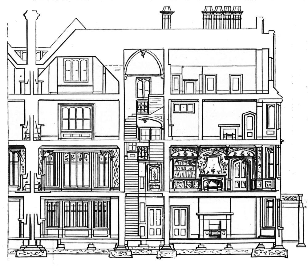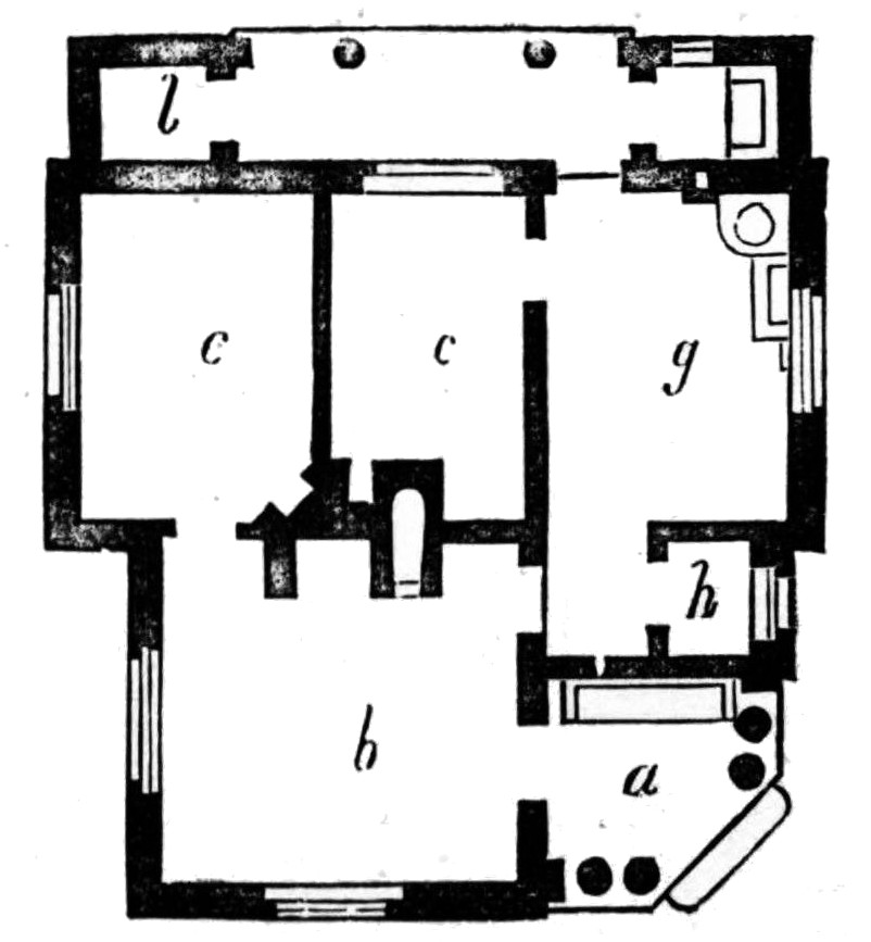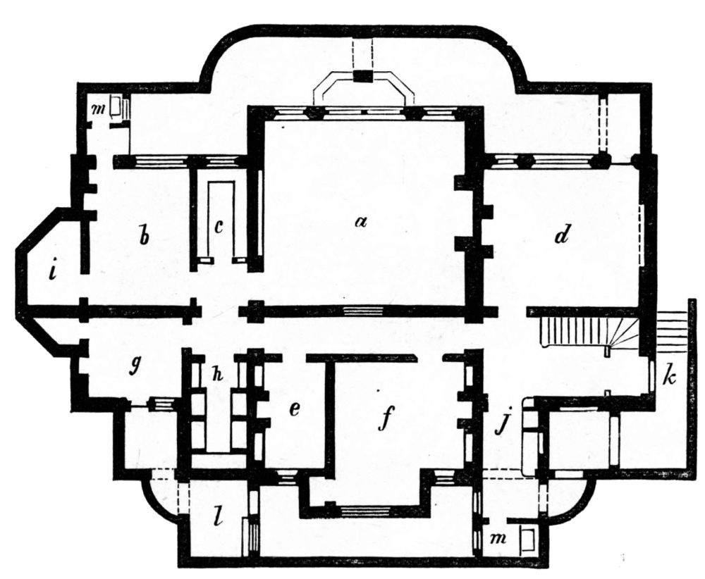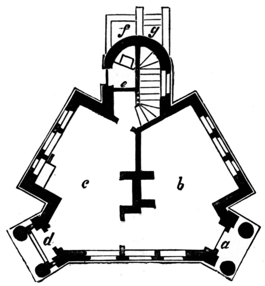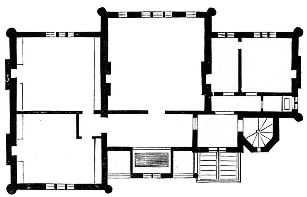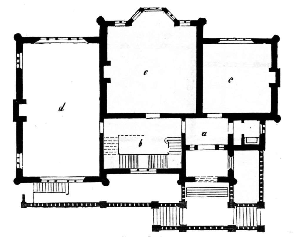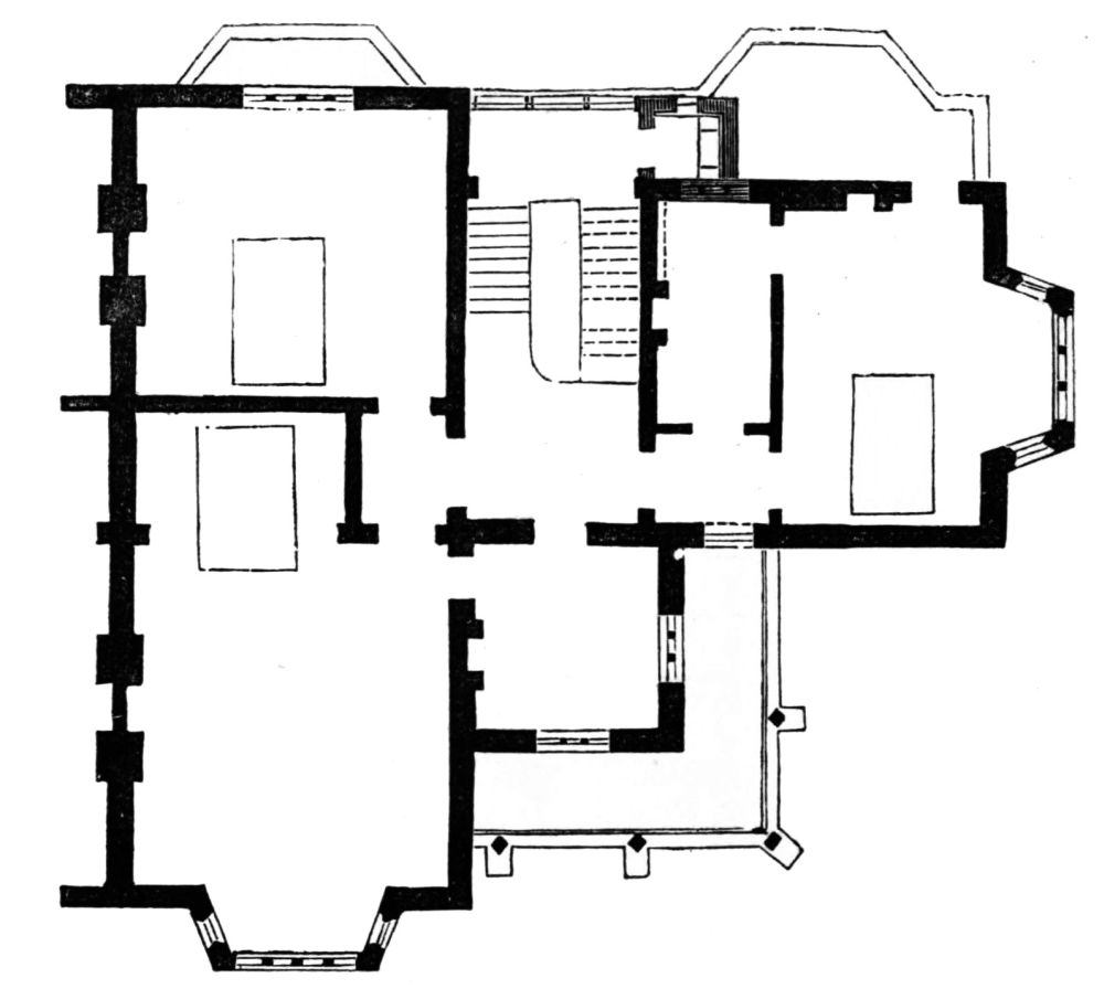 Most of the old mansions, &c., of this country and many parts of Continental Europe, have been erected in situations that were then immediately, and at little cost, available for the purpose. At one time the choice of such situation depended on careful attention to the special circumstances of those who erected the building. Thus it is found, generally, that the banks of the rivers, as affording ready and cheap means of carriage by the stream, were mostly chosen. Hence our abbeys, monasteries, &c., are frequently found in such localities. Baronial castles were usually erected on hills, the height of which tended to the security of the owners against sudden incursions of their foes. From the varied character of English topography has{15} arisen that great variety of picturesque beauty that distinguishes the ruins which abound in almost every county throughout the length and breadth of the land; such ruins, architecturally considered in relation to the surrounding circumstances of wood, vale, hill and dale, have become subjects of study and suggestion to modern architects, and models, constantly adopted at the present time, in certain details, for producing new designs. In the selection of these, or of any other style, however, Burke has laid down, in his essay on “The Sublime and Beautiful,” an excellent rule: “A true artist should put a generous deceit on the spectators, and effect the noblest designs by easy methods. Designs that are vast only by their dimensions, are always the sign of a common and low imagination. The work of art can be great but as it deceives; to be otherwise is the prerogative of nature only.”