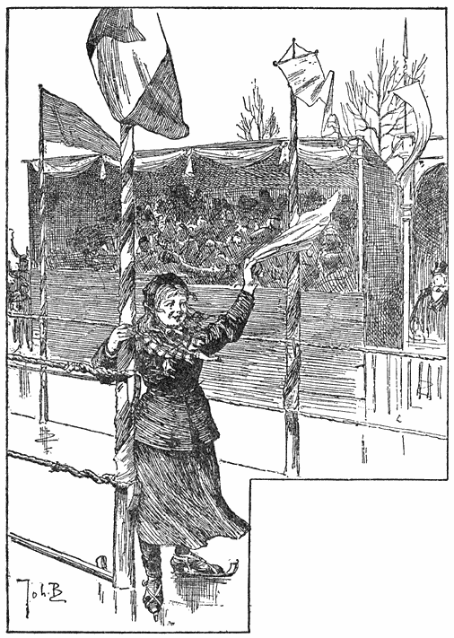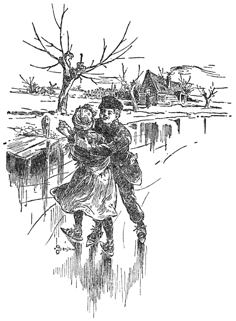Hans sprong weer op de beenen, maar ’t was geen gemakkelijke zaak om Griete in te halen: want zij was hem reeds een heel eind vooruit. Toch was zij nog niet ver, toen zij voelde, [4]dat ook haar schaatsen begonnen te krassen. Daar zij nu de eer aan zich wilde houden, keerde zij zich om en reed haar vervolger in de armen.