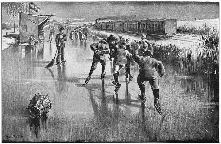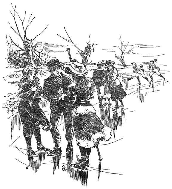 Zij reden herhaalde malen de vaart op en neder, en het was wèl te zien, dat er flinke schaatsenrijders onder hen waren. Menigen vriendelijken groet wisselden zij met andere dorpelingen, die hen voorbijreden, om zich naar Amsterdam of elders te begeven, en ook diegenen, aan wie zij ten eenen male onbekend waren, konden niet nalaten, met genoegen naar het vroolijke troepje te zien en het een groet toe te werpen. Ook van den wal af hadden zij bekijks genoeg van de kinderen, die te voet naar school gingen, en bij wie zich de meesten van hen straks zouden voegen.
