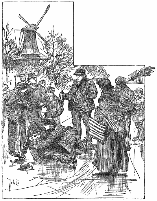 Eenige oogenblikken later reden zij lachend en vroolijk, hand aan hand over de vaart, zonder zich er over te bekommeren, of hun schaatsen al dan niet met ijzer beslagen waren. Maar eensklaps begonnen de schaatsen van Hans een raar soort van geluid te geven, zijn streken werden al korter en korter, flap! daar lag hij zoo lang als hij was op het ijs te spartelen.