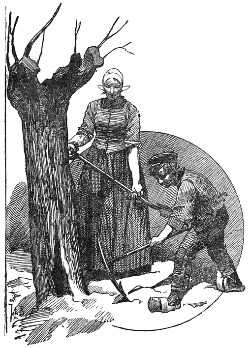 Die schaatsen waren het fabrikaat van Hans, den oudste der twee: want zijn moeder was een arme boerenvrouw, die geen schaatsen bekostigen kon; en daarom had onze knaap, die [2]zeer behendig in het snijden van hout was, er een paar voor zich en zijn zuster Griete vervaardigd, op welke zij reeds menig gelukkig uurtje op het ijs hadden gesleten. Met hun van de kou roode vingers trokken zij aan de touwen, terwijl hun gezichten zoo ernstig stonden, als moesten zij zich het beste paar Friesche schaatsen aanbinden.