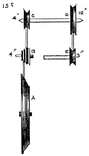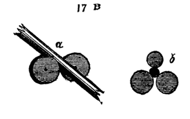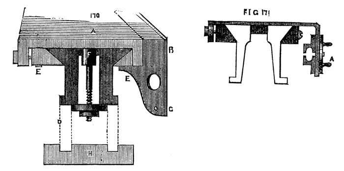 Two wheels of brass about two inches diameter, must then take the place of the centre screws. These are called friction wheels, and they must be placed sufficiently near each other to support the end of the axle between them, as shown in Fig. 17B, a and b. A pair of these must be thus fitted to each standard, and after the axle is placed in position a third may be placed above it to prevent the lathe cord from lifting the axle out of place by its tension. The axle and friction wheels will thus work together with an exquisitely smooth rolling motion—there will be no tendency to thrust the lathe standards apart as must result from tightening the ordinary centre screws, and the friction of the axle on its bearings will be reduced to a minimum. Any person acquainted with the use of the lathe may readily fit up these friction wheels, and the time and trouble so expended will be amply repaid by the superior ease with which the lathe can be used. We may say the same of the chain and eccentric, which can replace with similar advantage the crank and hook in ordinary use.