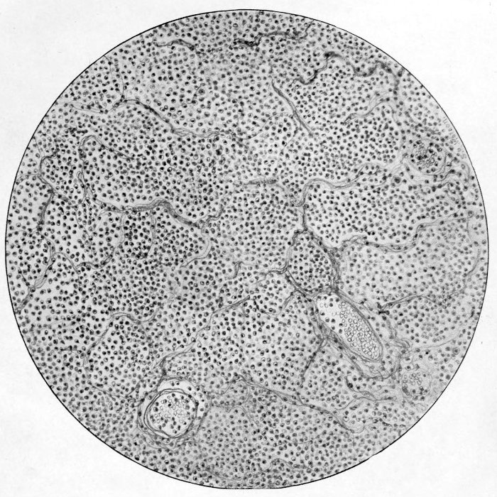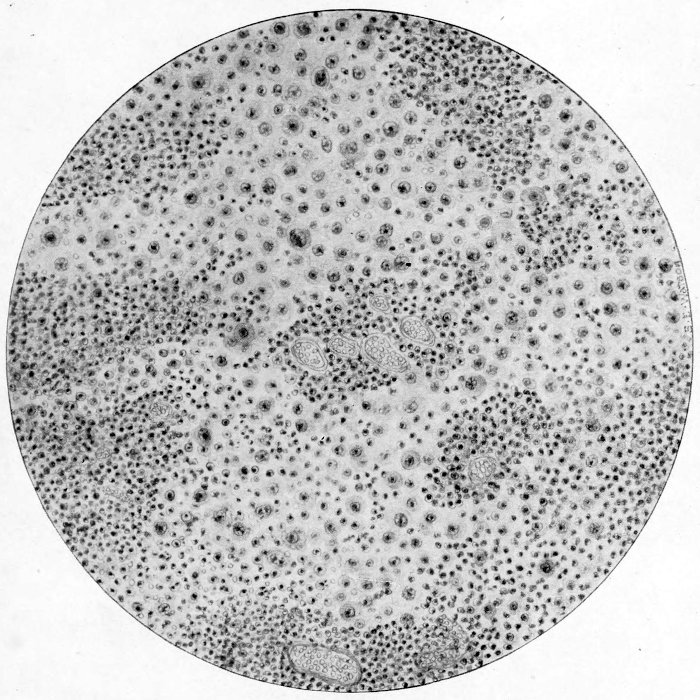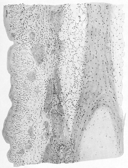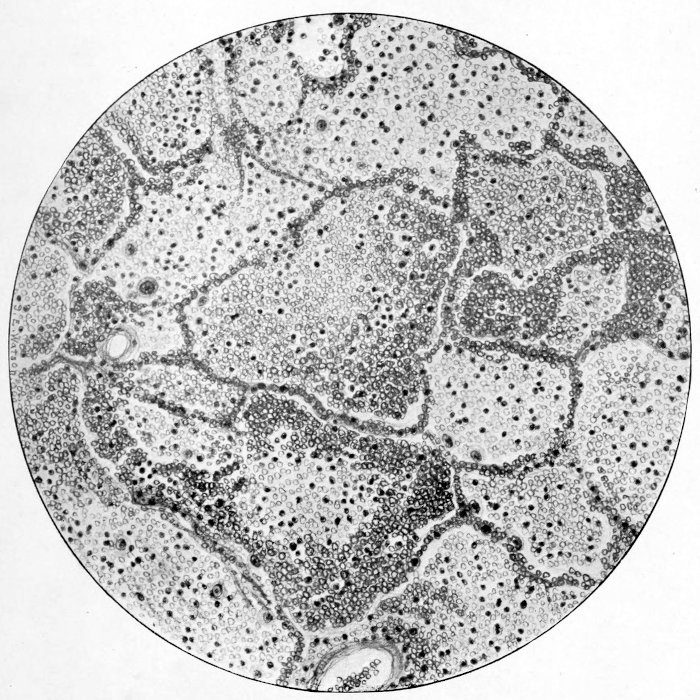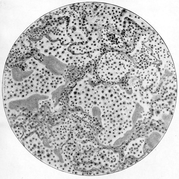 The response of the thoracic lymphatics, including those within the lung and mediastinum, is observed in all stages of pneumonia. But in epidemic influenza the reaction was much more prompt, appearing in the early stages and rapidly developing tissue changes along the channels and in the lymph nodes. The lymph channels during the period of the early serous pneumonia became dilated and filled with fluid with relatively few cells. The stroma immediately surrounding became œdematous, so that in the gross specimen the connective tissue between the lobules of lung were sometimes easily seen as gray strands. At this time this tissue was not increased in quantity and did not project above the level of the cut lung. The fibrous tissue remained soft and pliable, but formed quite wide strands. When the pulmonary reaction became hemorrhagic, red blood cells, leucocytes and large mononuclears were found mixed with the fluid in the lymphatics. We had no way of determining the direction of the lymph flow from the pulmonary tissues, but it was assumed that as there was no excessive loss of serous fluid from the lung and the lymphatics beneath pleura into the chest cavities that the fluid was draining through the channels lying about the bronchi and vessels. The further evidence of the direction of flow was seen in the rapid and comparable responses which occurred in the lymph glands along these routes. The glands about the bronchi and at the hilus became enlarged, red and succulent. The glands were often two and one-half centimeters in diameter. Their capsule was thin and stretched and the gland was quite soft. Many of them when cut open were almost diffluent.