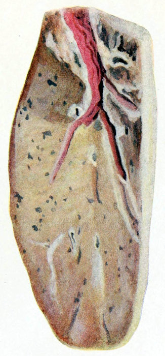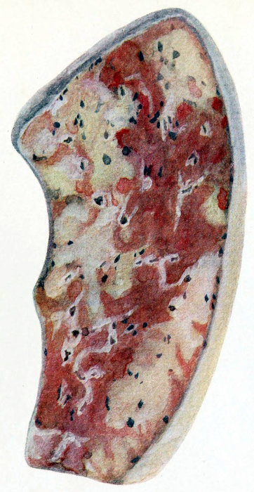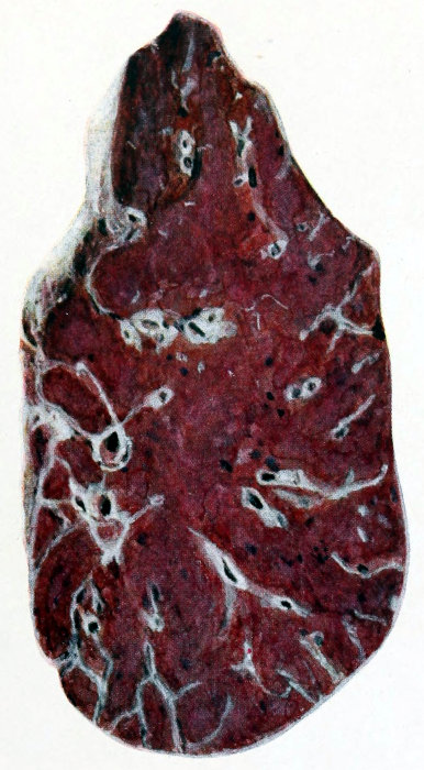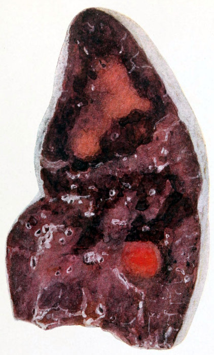 | Fig. v. | Acute hemorrhagic and purulent lobular pneumonia. The purulent process is seen to be advancing from the focal type to the more diffuse lobar by fusion of the neighboring lobules. |