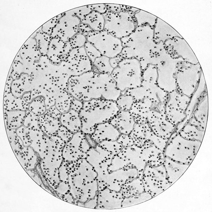 The recent epidemic of influenza has afforded a series of interesting autopsies in view of the very extensive and peculiar involvement that occurred in the lungs of the cases examined. Ordinary lobar pneumonia, as we know it, was not observed, although it must be said that the lungs many times exhibited a consolidation of a lobar distribution. The usual dry granular lung of the more common pneumonia was absent, and in its stead a most unusual series of pictures was observed in the several cases. A common feature of all cases was the œdema of the lung tissue, which in the majority of instances contained such an amount of fluid that it ran freely from the cut surface in almost unlimited quantity. This fluid varied in its color and consistence depending upon the age of the process. In the very early cases the lungs were boggy, very congested, and a thin serosanguinous fluid poured forth from the cut surface. It actually appeared as though the fluid within the tissue was under considerable pressure. At times blotchy deep red hemorrhages occurred in the lung substance, and hemorrhages of a bright red color were not infrequent in the pleura. That the circulation of the lungs was much embarrassed was often prettily demonstrated by the dilatation of the fine capillaries and lymphatics beneath the pleura. These small vessels stood out prominently as a meshwork more or less outlining the areas supplied by them. Not only was the peculiar consolidation in lobar arrangement, but also in many cases was there evidence of a lobular distribution. Even in some cases where the entire lobe was consolidated the cut surface presented a peculiar lobulation with patches of lung tissue projecting above the general surface. The wet trabeculated structure of the lung in this stage did not give the impression of true red hepatization, but rather a structure resembling spleen and at times a meaty, compact, glassy picture not unlike thyroid.
