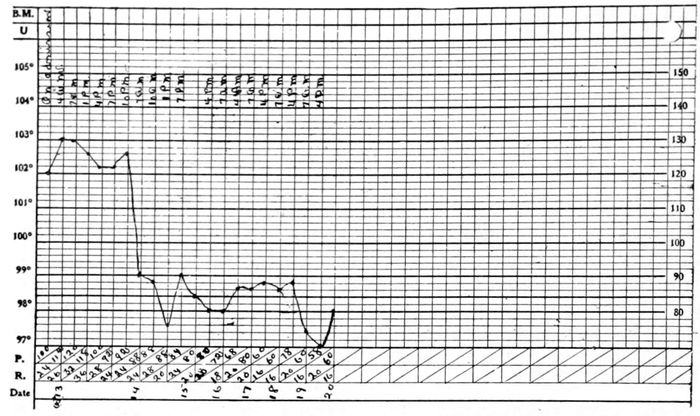 Or the temperature might fall one or two degrees for a day or so after the first rise, and then go up again for one or two more days, and subside by lysis as is shown in Chart II.