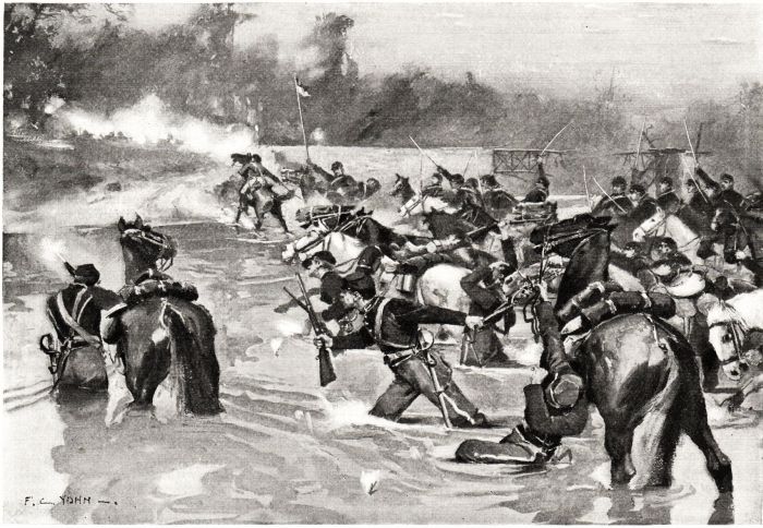 Despite the fact that the men had been in the saddle almost the whole night, they were keen to move; and before sunrise General Merritt, in command of the First Division, ordered Colonel Lowell, who led the reserve brigade, to carry the ford and effect a lodgement on the farther bank. At once Colonel Lowell dismounted a portion of his command, and with a cheer the men dashed into the water, and holding their carbines high above their heads, plashed through the stream, many standing waist-deep and replying to the fire that was poured into them. The Fifth United States Cavalry and a portion of the Second Massachusetts infantry followed at once.