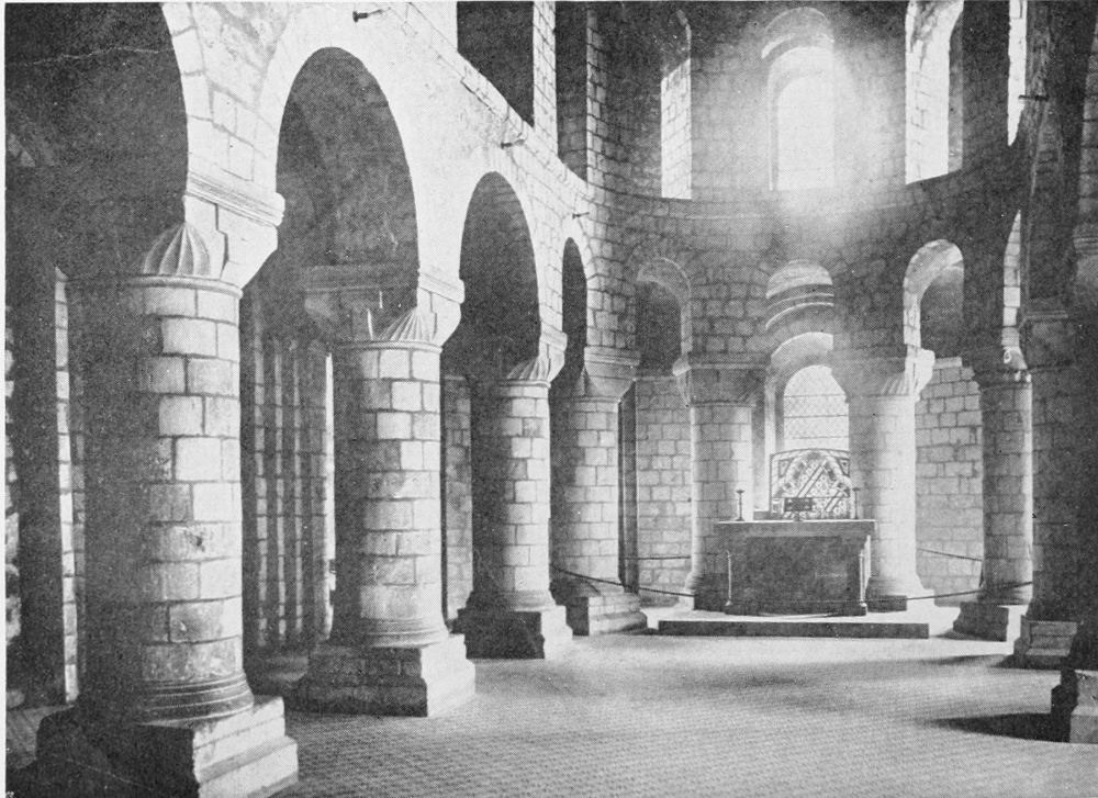 The most interesting examples of primitive structure are the so-called Cromlechs, of which that of Stonehenge, in England, is the best preserved. The unit of this and like remains is the “post and beam” formation, composed of a block of stone, supported on two uprights. In the case of Stonehenge this formation was repeated so as to form a continuous circle one hundred feet in diameter. Within this was a concentric circle, composed of smaller slabs, which enclosed a series of five separate post and beam structures on a horse-shoe plan. The latter is repeated by another series of slabs and in the centre stands the flat altar stone. Seventeen stones of the outer circle, varying from sixteen to eighteen feet in height, are still standing and in part connected by their beam slabs.