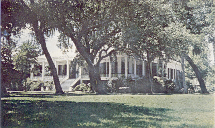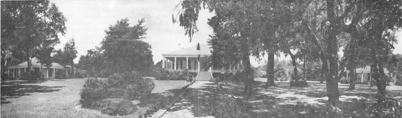 Some of the attractive features of the approach to Beauvoir House are the huge live oak trees, festooned with gray moss; the few remaining ancient cedars, marking the dim outline of the once circular driveway; the flowers and shrubs, planted to simulate the use made of them in the old days; the broad brick walk, replacing the old shell walk, leading direct to the fan shaped steps of hand dressed cypress with hand turned spindle bannisters; the inviting broad galleries, extending far around on either side of the house; and the large double doors, with the upper portion small panes of choice etched glass, serving as an artistic entrance doorway.