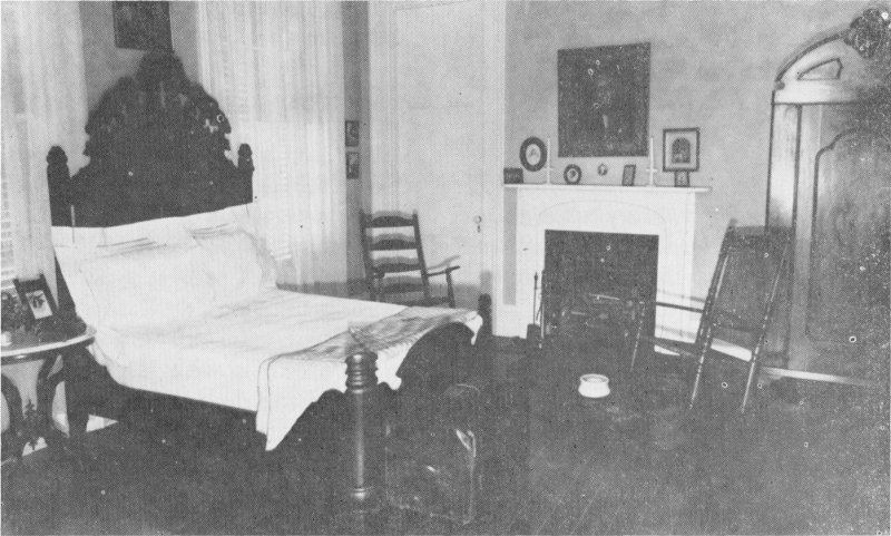 The Front Parlor used by the Davis family as their parlor has, as has the back parlor or library, the same rounded corners, high ceiling, and frescoed walls and ceiling found in the reception hall. It is furnished almost entirely with original pieces; but the fine portrait of Jefferson Davis made after his 81st birthday is not one of these. It was painted by G. B. Matthews and presented to the Shrine by Mrs. Darling of New York. At the left of the door is a portrait of Mr. Davis’ mother.