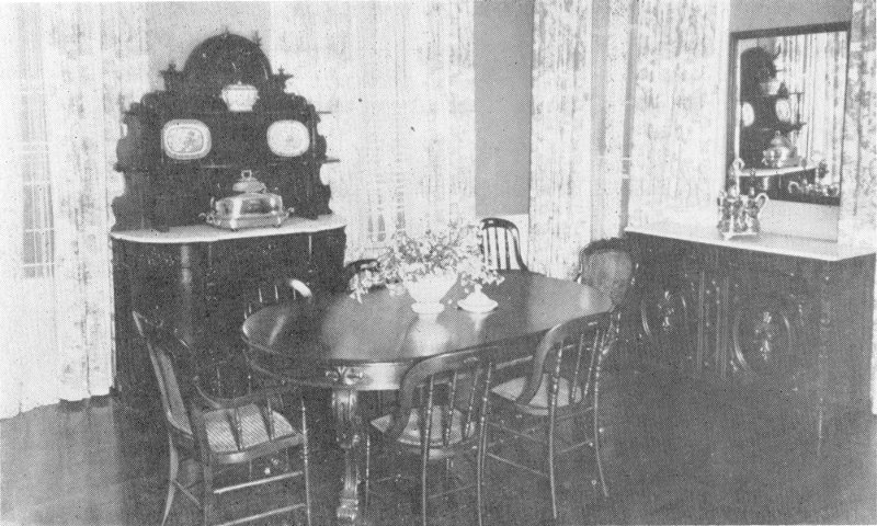 The table, chairs, and large sideboard in the dining room are original Davis pieces, given to Judge and Mrs. A. McC. Kimbrough of Greenwood, Mississippi and the Gulf Coast, when Beauvoir was dismantled. They were kept intact by them as long as they lived, and by their family after their deaths. Later, responding to the need of these original pieces in making Beauvoir a Jefferson Davis Shrine, the Kimbrough 23 family loaned them for use in their original setting. The painting on the board, forming a part of the mantel in this small but attractive dining room, was done by Winnie Davis. Draperies and glass curtains are replacements.