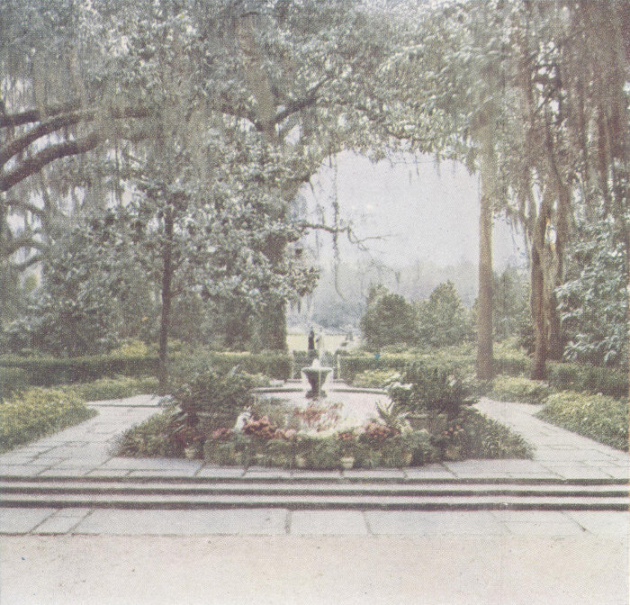 A fountain, canopied by waving gray moss, presents one of the loveliest scenes in this “Charm Spot of the Deep South.” It seems to whisper, “Here We Rest.”