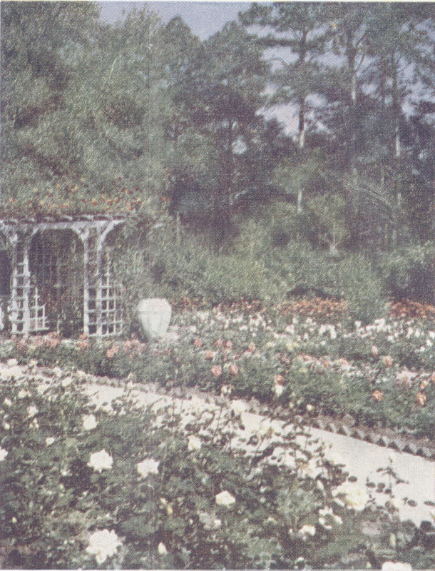 The lovely rose also adds its charm to the beauty of Bellingrath Gardens. In a corner of their own they bloom profusely to delight the many visitors. This Rose Garden contains over a thousand bushes planted in beds laid out in design like a Rotary Wheel.