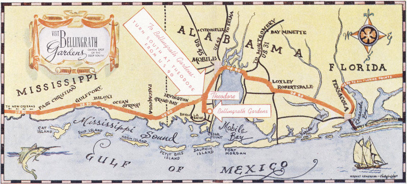 For information concerning Bellingrath Gardens, inquire at any AAA office or your Tourist Information Bureau, “Ask Mr. Foster” Service, or write direct to Bellingrath Gardens, Mobile, Alabama. Western Union and long distance telephone service are available at Gardens. Regular round-trip bus service from Mobile to the Gardens each morning and afternoon at special rate.