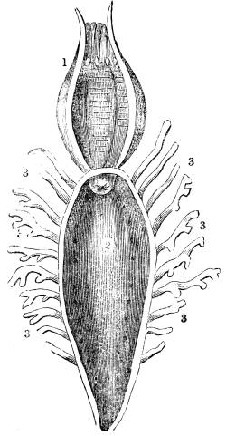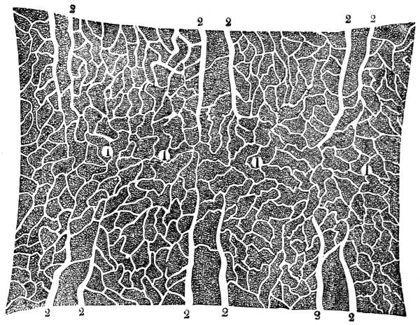 337. In creatures somewhat higher in the scale, a portion of the external surface is reflected inwards in the form of a sac, with an external opening (fig. CXXV. 1). In some medusæ there are numerous sacs of this kind, which pass inwards until they are separated only by thin septa from16 the cavities of the stomach. The water permeating and filling these sacs comes into contact with an interior portion of the body, not to be reached through the external surface. At the margin of the disk (fig. CXXV. 6) there is spread out a delicate net-work of vessels (fig. CXXV. 5); these vessels communicate with small canals (fig. CXXV. 4) which open into larger canals (fig. CXXV. 3) that proceed directly from the stomach (fig. CXXV. 2). As the aliment is prepared by the stomach, it is transmitted thence by these communicating canals to the exterior net-work of vessels where it is aërated.