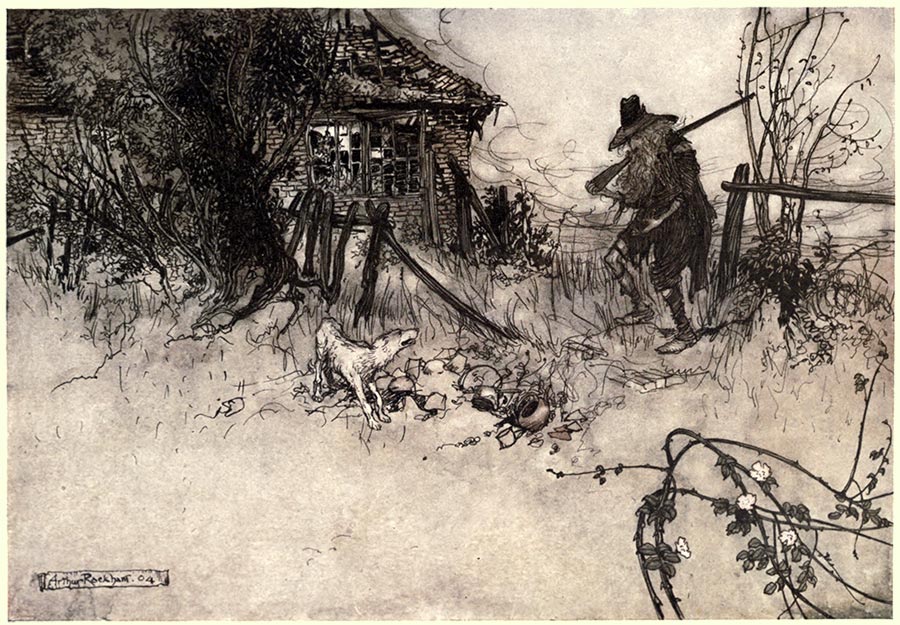 17 It was with some difficulty that he found the way to his own house, which he approached with silent awe, expecting every moment to hear the shrill voice of Dame Van Winkle. He found the house gone to decay—the roof had fallen in, the windows shattered, and the doors off the hinges. A half-starved dog that looked like Wolf was skulking about it. Rip called him by name, but the cur snarled, showed his teeth, and passed on. This was an unkind cut indeed. “My very dog,” sighed poor Rip, “has forgotten me!”