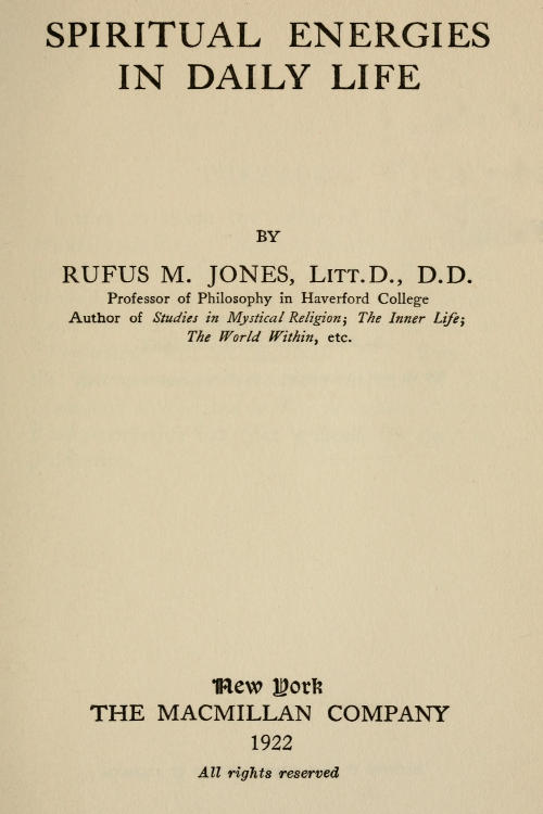 Project Gutenberg's Spiritual Energies In Daily Life, by Rufus M. Jones This eBook is for the use of anyone anywhere in the United States and most other parts of the world at no cost and with almost no restrictions whatsoever. You may copy it, give it away or re-use it under the terms of the Project Gutenberg License included with this eBook or online at www.gutenberg.org. If you are not located in the United States, you'll have to check the laws of the country where you are located before using this ebook. Title: Spiritual Energies In Daily Life Author: Rufus M. Jones Release Date: December 22, 2019 [EBook #61004] Language: English Character set encoding: UTF-8 *** START OF THIS PROJECT GUTENBERG EBOOK SPIRITUAL ENERGIES IN DAILY LIFE *** Produced by WebRover, QuakerHeron, Monicas wicked stepmother and the Online Distributed Proofreading Team at http://www.pgdp.net (This file was produced from images generously made available by The Internet Archive)