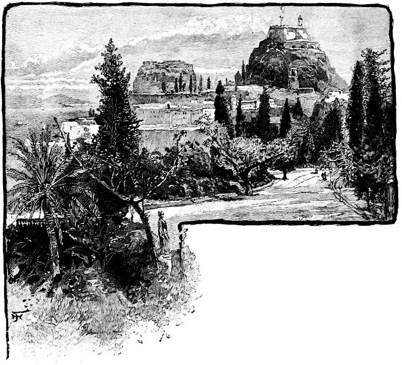 The English occupation endowed the island with good roads, 17 most of which are maintained in fair condition still; and a winter’s sojourn here lacks nothing which could be expected in the compass of ten by thirty miles, with two posts per week from Europe. The fruits are those of the northern Mediterranean in great perfection, the oranges being only second to those of Crete; the waters are still well supplied with fish, though the people do all they can to exterminate them by the use of dynamite in fishing; and the Bella Venezia is a hotel which, though still strange to the resources of our American caravansaries, is more appropriate to the ways of the East and of idle people than are ours. The kindly, honest old host, appropriately known as Dionysos, lacks but little of giving to the stranger the hospitality of Alcinoüs. And life is so cheap that one who has worn out the world and realized an income of a thousand dollars a year may find a Macarian peace in an upper room of the Bella Venezia, with windows looking out on the beautiful mountains of Epirus, snow-clad all winter, and the bright blue of the intervening sea, with the coming, going, and merely passing ships of all nations; and, when the sun is low, have a comfortable carriage to thread the labyrinths of the immense olive groves which form almost the only shade in the island. Here one meets men of all races—Turkish reliefs on their way from Stamboul to Durazzo, or Scutari of Albania; white-skirted palikars from Epirus; Eastern Jews, with their characteristic long robes; Persians, Montenegrins, Peloponnesians, etc., who, changing steamers here, or glad to breathe a land air during the stay in port of their steamers, stroll up and down the parade, with the easy-going townsmen and tourists of all nations, seeing the island in comfort or rushing over it in the custody of Cook or Gaze, to carry away a confused remembrance of Corfu and Syra, hardly recalling which was which.