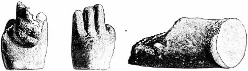 The position of the grotto makes the only difficulty in tracing all his movements; for it is not, as one would expect from the text, at the head of the port, strictly speaking, but at the head of the little ravine which ends in the port, a good quarter of an hour’s walk from the shore, even making allowance for all the recession of the water-line, which has evidently been considerable. The grotto itself corresponds exactly with the description, and can be entered by mortals only in the usual way, by the small opening which looks toward the port. “It has two entrances: one, turned toward the breath of Boreas, is for human use; the other, toward that of Notos, is more divine. Never man enters by that; it is the way of the 30 immortals.” The human entrance is a low, almost invisible opening, or at least, easily passed without notice, at a short distance. Even now, when all vegetation has disappeared from around it, and the olive-trees come only half-way up the hill, it would easily be hidden by a large stone, as Minerva hides it. The entrance, low and precipitous, widens rapidly within, and we descend by what might once have been artificially prepared steps to a vault-like cave, sixteen to twenty feet in diameter, with a curious recess at the farther end, and at the top of the vault another opening, like the top window of the Pantheon of Rome, or any of the circular temples whose form was derived from the vaulted tomb or treasury of Pelasgic architecture. At first sight I thought this opening might have been artificial, but on close examination I saw that the formation of the rock led to it naturally, and that, hardly large enough to admit a human body readily, it could only, if enlarged, be entered by a person’s being let down with a cord. This is the “immortals’ entrance.” Under this opening lies a huge heap of stones, the accumulation of centuries, for the lower portions are cemented together by the stalagmitic deposit from the rock above; and the walls of the grotto, despite the breaking off of every attackable stalactite, are also formed of carbonate of lime so deposited. The difference between the actual distance from the water’s edge to the grotto and that which is indicated by the narrative of the Odyssey is not more than a fair poetic license would permit; or the memory of the narrator, having known the localities, might well in a few years of absence leave out this short distance.