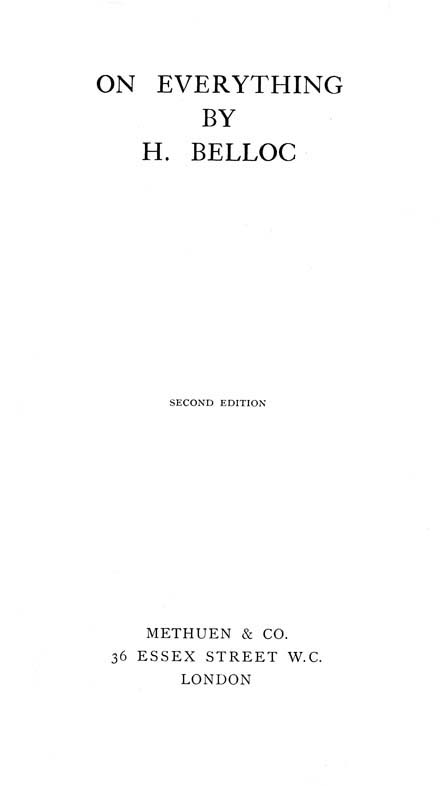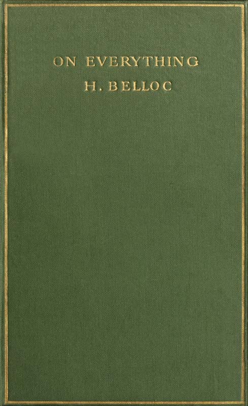 The Project Gutenberg EBook of On Everything, by Hilaire Belloc This eBook is for the use of anyone anywhere in the United States and most other parts of the world at no cost and with almost no restrictions whatsoever. You may copy it, give it away or re-use it under the terms of the Project Gutenberg License included with this eBook or online at www.gutenberg.org. If you are not located in the United States, you'll have to check the laws of the country where you are located before using this ebook. Title: On Everything Author: Hilaire Belloc Release Date: January 2, 2020 [EBook #61076] Language: English Character set encoding: ISO-8859-1 *** START OF THIS PROJECT GUTENBERG EBOOK ON EVERYTHING *** Produced by Tim Lindell, David E. Brown, and the Online Distributed Proofreading Team at http://www.pgdp.net (This file was produced from images generously made available by The Internet Archive/Canadian Libraries)
