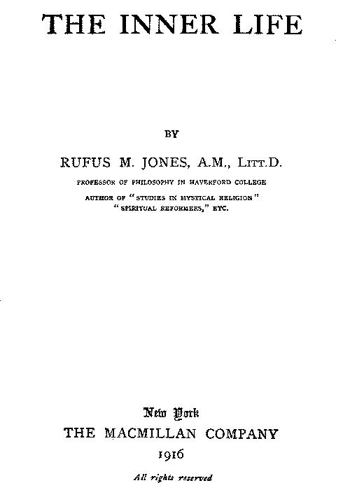 The Project Gutenberg EBook of The Inner Life, by Rufus M. Jones This eBook is for the use of anyone anywhere in the United States and most other parts of the world at no cost and with almost no restrictions whatsoever. You may copy it, give it away or re-use it under the terms of the Project Gutenberg License included with this eBook or online at www.gutenberg.org. If you are not located in the United States, you'll have to check the laws of the country where you are located before using this ebook. Title: The Inner Life Author: Rufus M. Jones Release Date: January 2, 2020 [EBook #61078] Language: English Character set encoding: UTF-8 *** START OF THIS PROJECT GUTENBERG EBOOK THE INNER LIFE *** Produced by WebRover, QuakerHeron and the Online Distributed Proofreading Team at http://www.pgdp.net (This file was produced from images generously made available by The Internet Archive)