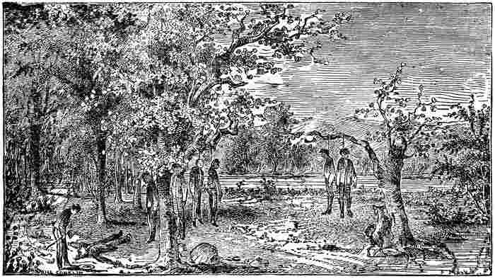 Before daylight the next morning the entire party were hidden in some heavy timber about two miles west of Walker’s house. There these seven men stayed, none of them stirring, except Quantrell. Several times during the day, however, he went backwards and forwards, apparently to the fields where the negroes were at work, and whenever he returned he brought something either for the horses or the men to eat.