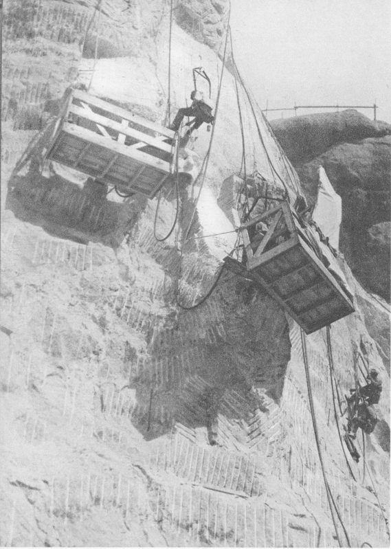 Scaffolding suspended from cables enabled the workmen to reach down from the brow of the mountain in order to carry on their courageous and difficult labors.