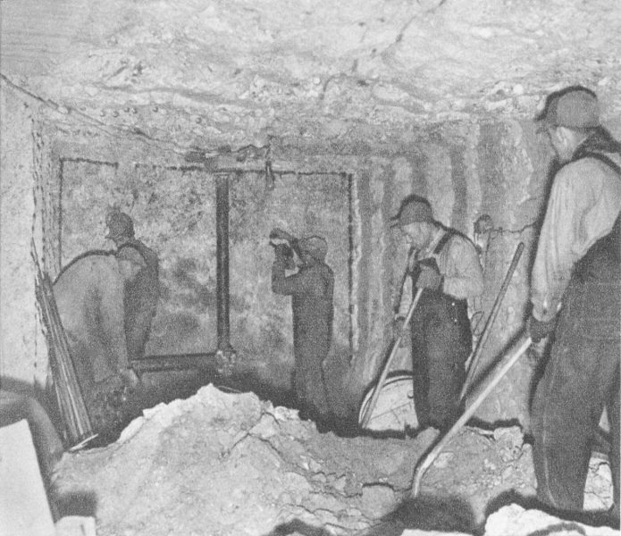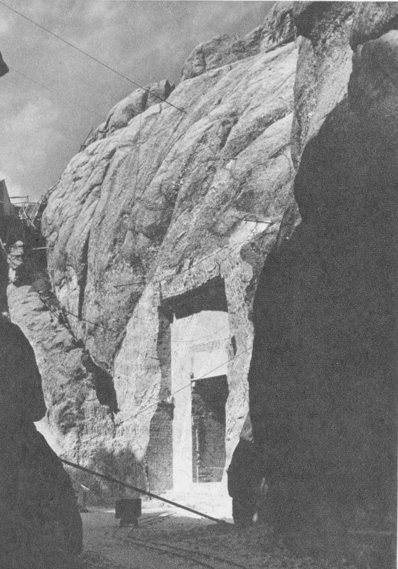 The Hall of Records and Stairway have been part of the Memorial plan from the beginning and are provided for in the so-called “Rushmore Bill” of 1938. A good start has been made in the carving of the Hall, which already has been excavated to the extent of seventy feet. Great care has to be exercised in the use of dynamite in carving this hall, as in carving the faces on the mountain, not to injure the stone which is to remain. Careless explosions of large amounts of powder might crumble the walls.