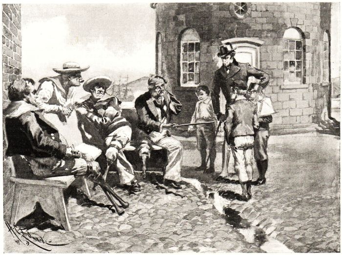 I have gone on too long. One more picture, and I have done. On the Hard, along the railings which ran in the front, only ceasing with the beach and the Logs, extended a long bench, on which every morning all the year round, except in rain and snow, there sat a row of grizzled veterans. They were mostly one-legged; some were no-legged. The bench presented a very remarkable spectacle of "timber toes," i.e., wooden legs sticking out in a horizontal row. The owners of the "timber toes" were affable; they would graciously accept a quid, or the price of one, or the equivalent of a quartern of rum, and in return they would cheerfully tip you a yarn—but, for choice, beyond the hearing of the other old boys. Now the really remarkable thing about these heroes was that every man among them had been on board the Victory at Trafalgar; every man among them had been the first man to observe when Nelson fell, the first man to pick him up, the chief hand in carrying him to the cockpit, the trusted man kept down by the surgeon to perform the last offices for the dying Admiral. Nay, so often had every man told this story that he had at last come to believe it; and the genuine tears would crowd into his eyes when he arrived at the last scene in the mournful history: "'Kiss me, 'Ardy,' was the last words of the Dyinero." They had of course other memories which were, I believe, more authentic. There were memories of the American war in 1814, of French prisons, of actions long since forgotten, of admirals whose fame has been eclipsed by that of Nelson. I remember one man who was in the Mutiny at the Nore, which was in 1796; and one ancient mariner I remember who said he was a cabin-boy with Captain Cook in his last voyage—he saw him speared. Well, it was quite possible; the man looked a mere monument of antiquity; it was quite possible if he was eighty-eight—he looked ninety-eight. It was quite possible, on the other hand—but let me believe that I have myself conversed and shaken hands with one of Captain Cook's crew.