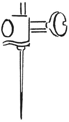 To push the needle through the material with the end of the thimble, hold the needle between the thumb and the first finger so that the eye end of the needle is resting against the end of the thimble.