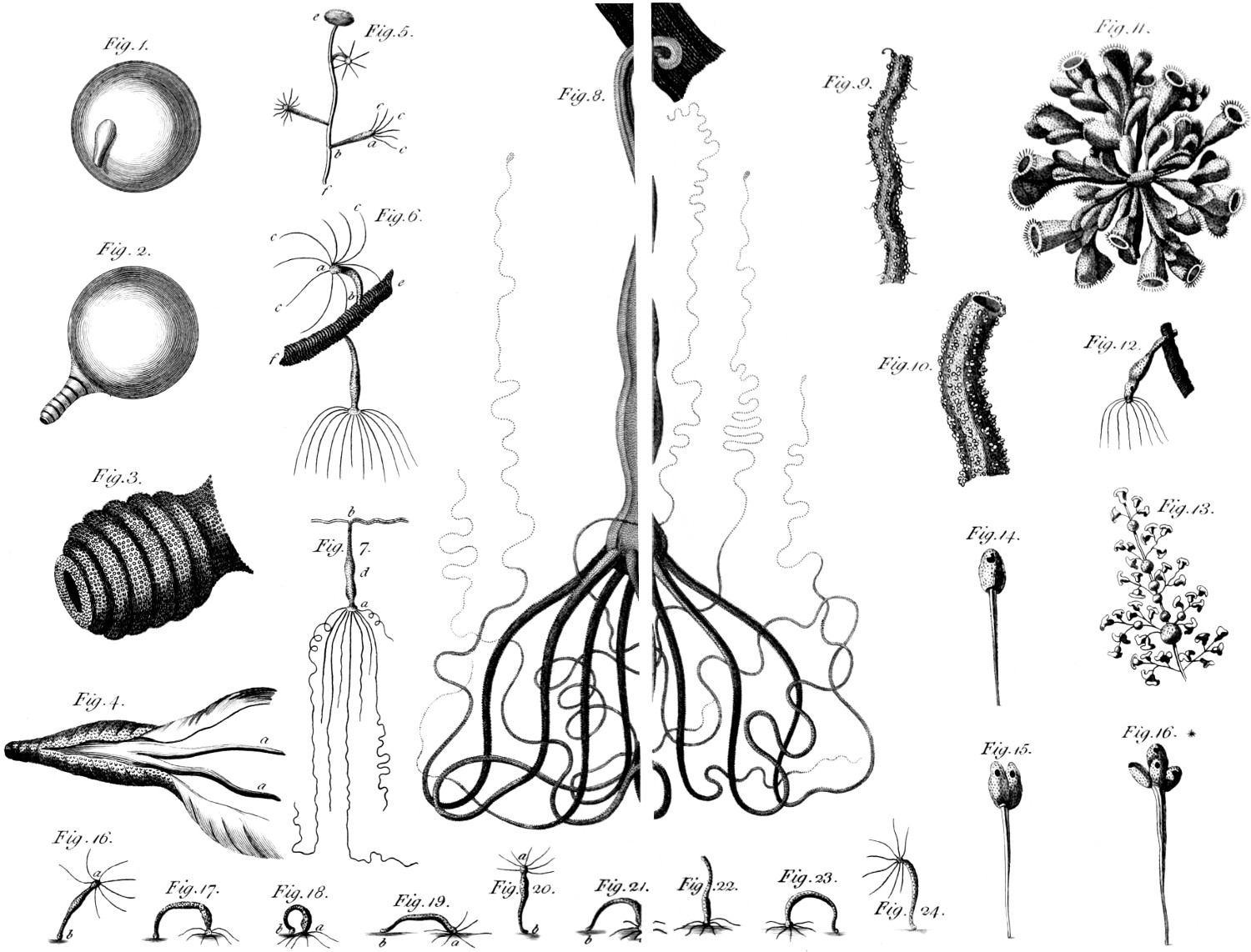 To describe the fresh-water polype or hydra; to give a short history of the discovery of these curious animals, and some account of their singular properties, is the business of the succeeding chapter. The properties of these animals are so extraordinary, that they were considered at first to be as contrary to the common course of nature, as they really were to the received opinions of animal life. Indeed, who can even now contemplate without astonishment animals that multiply by slips and shoots like a plant? that may be grafted together as one tree to another, that may be turned inside out like a glove, and yet live, act, and perform all the various functions of their contracted spheres? As nearly allied to these, the chapter finishes with an account of those vorticellæ which have been enumerated by Linnæus. It has been my endeavour to dissipate confusion by the introduction of order, to dispose into method, and select under proper heads the substance of all that is known relative to these little creatures, and in the compass of a few pages to give the reader the information that is dispersed through volumes.