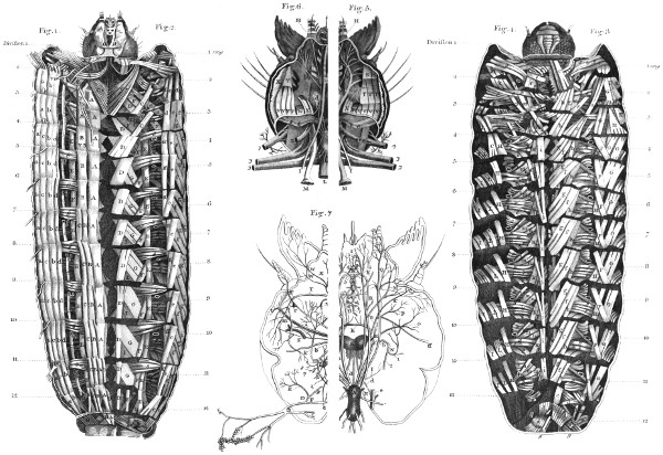 In the next chapter I have endeavoured to give the reader some idea of the internal parts of insects, principally from M. Lyonet’s Anatomical and Microscopical Description of the Caterpillar of the Cossus or Goat-moth. As this book is but little known in our country, I concluded that a specimen of the indefatigable labour of this patient and humane anatomist would be acceptable to all lovers of the microscope; and I have, therefore, appropriated a plate, which, whilst it shews what may be effected when microscopic observation is accompanied by patience and industry, displays also the wonderful organization of this insect. This is followed by a description of several miscellaneous objects, of which no proper idea could be formed without the assistance of glasses.