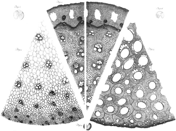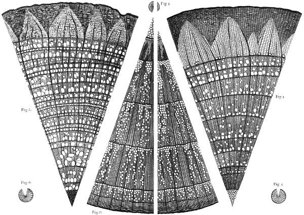 The construction of timber, and the disposition of its component parts, as seen by the microscope, is the subject of the next chapter; a subject confessedly obscure. With what degree of success this attempt has been prosecuted, must be left to the judgment of the reader. The best treatise on this part of vegetation is that of M. Du Hamel du Monceau sur la Physique des Arbres. If either my time or situation in life would have permitted it, I should have followed his plan; but being confined to business and to London, I can only recommend it to those lovers of the works of the Almighty, who live in the country, to pursue this important branch of natural history. There is no doubt but that new views of the operations in nature, and of the wisdom with which all things are contrived, would amply repay the labour of investigation. Every part of the vegetable kingdom is rich in microscopic beauties, from the stateliest tree of the forest, from the cedar of Lebanon, to the lowliest moss and the hyssop that springeth out of the wall; all conspiring to say how much is hid from the natural sight of man, how little can be known till it receives assistance, and is benefited by adventitious aid.