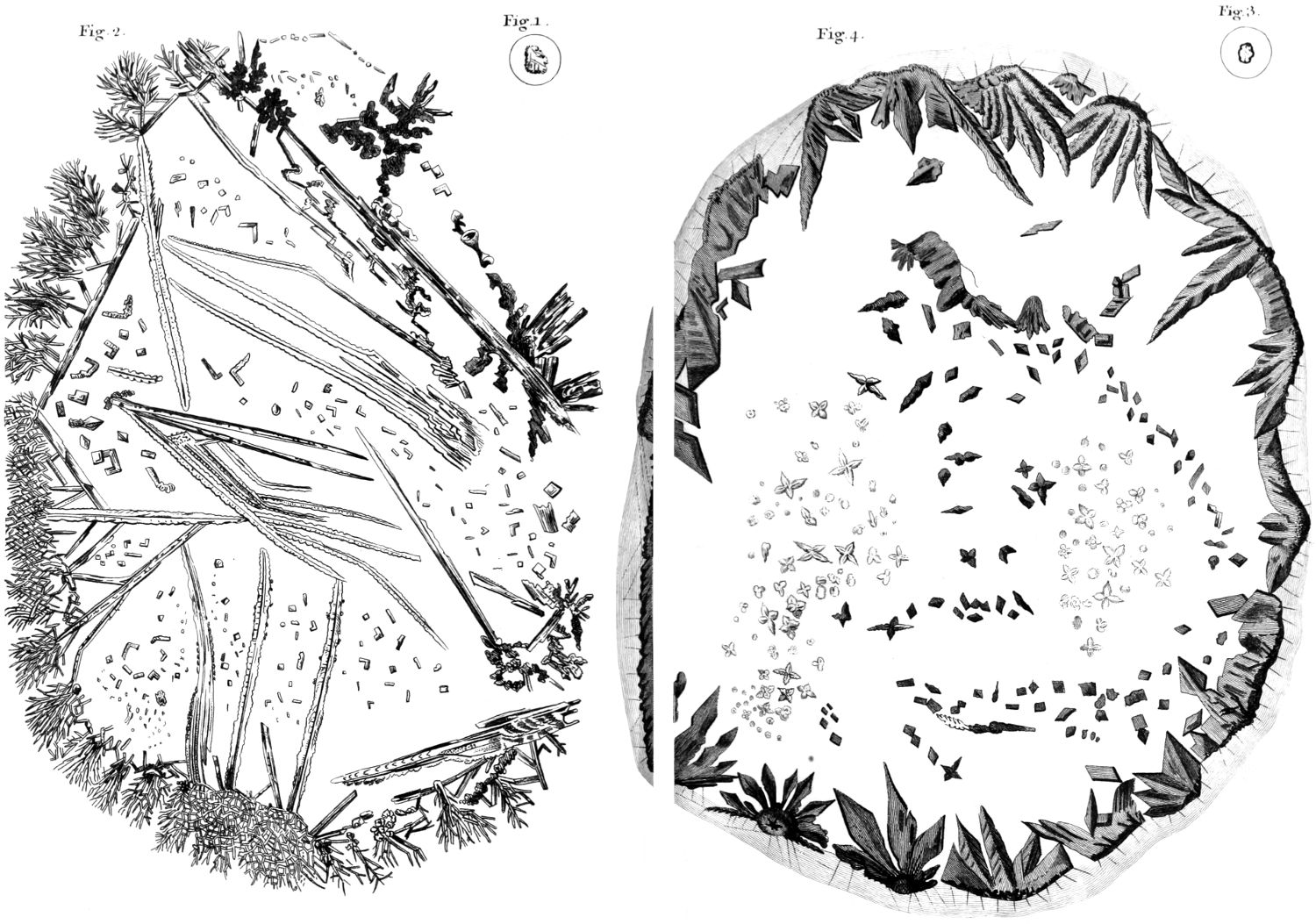 From the wonderful organization of animals, and the curious texture of vegetables, we proceed to the mineral kingdom, and take a cursory view of the configuration of salts and saline substances, exhibiting a few specimens of the beautiful order in which they arrange themselves under the eye, after having been separated by dissolution; every species working as it were upon a different plan, and producing cubes, pyramids, hexagons, or some other figure peculiar to itself, with a constant regularity amidst boundless variety.