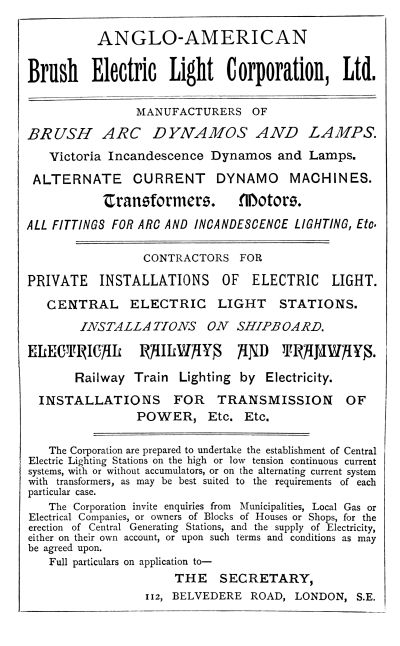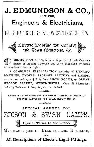 The art of lighting by Electricity practically dates from ten years ago, and it has during that period received the constant attention of both Electrical Engineers and others, who have applied the greatest scientific knowledge. The result of all this energy appears to be discouraging. Five hundred thousand pounds have been subscribed to carry on the business, and it is doubtful whether the companies which survive have a market value of one-tenth of that sum. The experience may have been bought too dearly, but the era of Central-Station Electric Lighting, which has now commenced, ought to re-establish the position of Electricity in financial circles, and afford a safe and profitable outlet for the surplus capital of the investor who buys gas and water shares to pay four per cent.