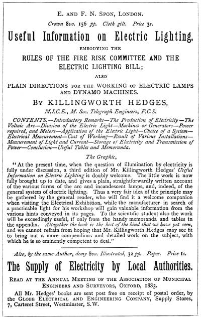 The remarks of Lord Herschell that the “electric light is more used in the South Sea Islands than in this country” ought to be taken as not so much referring to want of enterprise on the part of capitalists and engineers, but to the Electrical Facilities Act of 1882, which has been appropriately termed a very “boa-constrictor.”